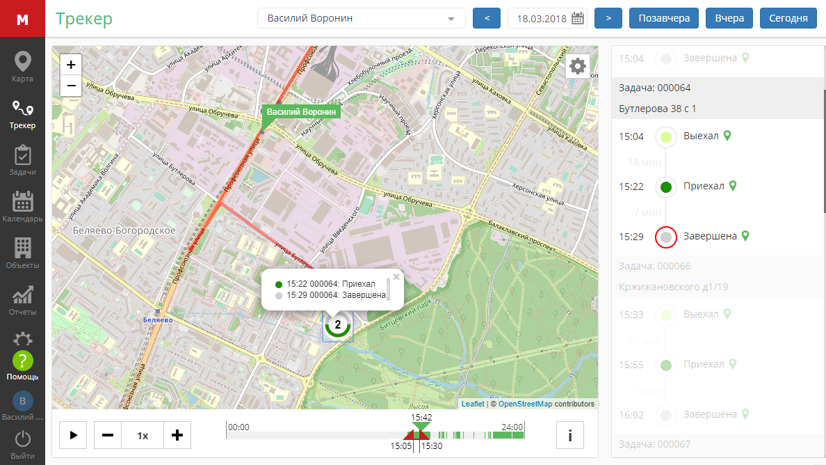 - Полноценный трек всех перемещений сотрудника за день, а также плеер с возможностью “проиграть” рабочий день сотрудника на карте в привязке к поставленным задачам.