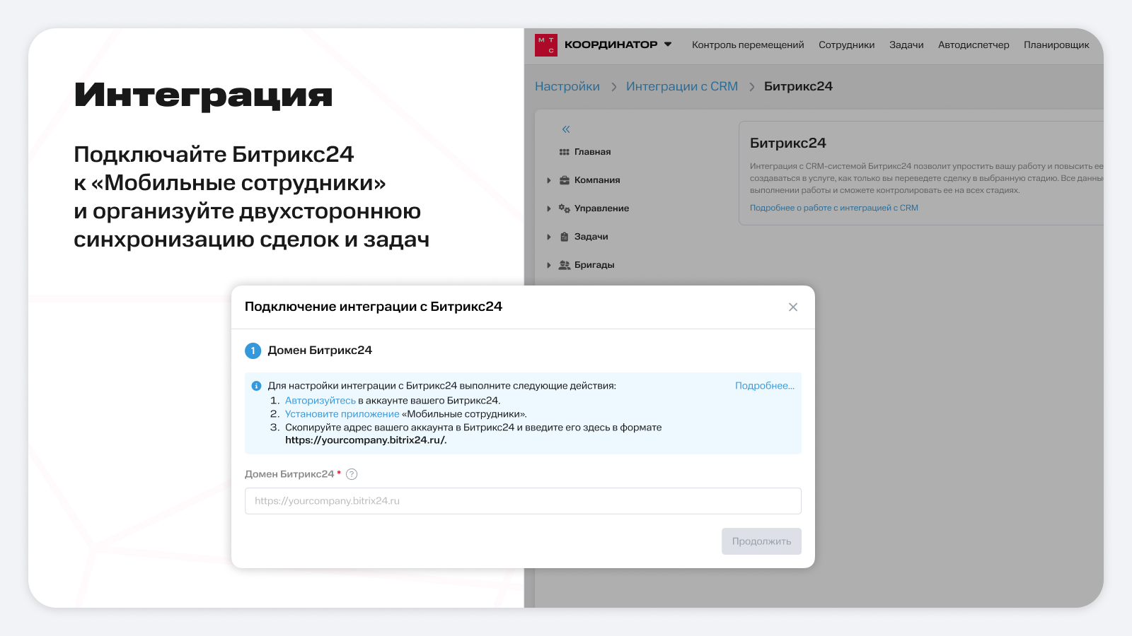 Данное приложение помогает интегрировать услугу «Мобильные сотрудники» со сделками в Битрикс24, а также организовать двухстороннюю синхронизацию сделок и задач: передачу данных из сделок в задачу в «Мобильные сотрудники» и получение данных из форм задач в Битрикс24.