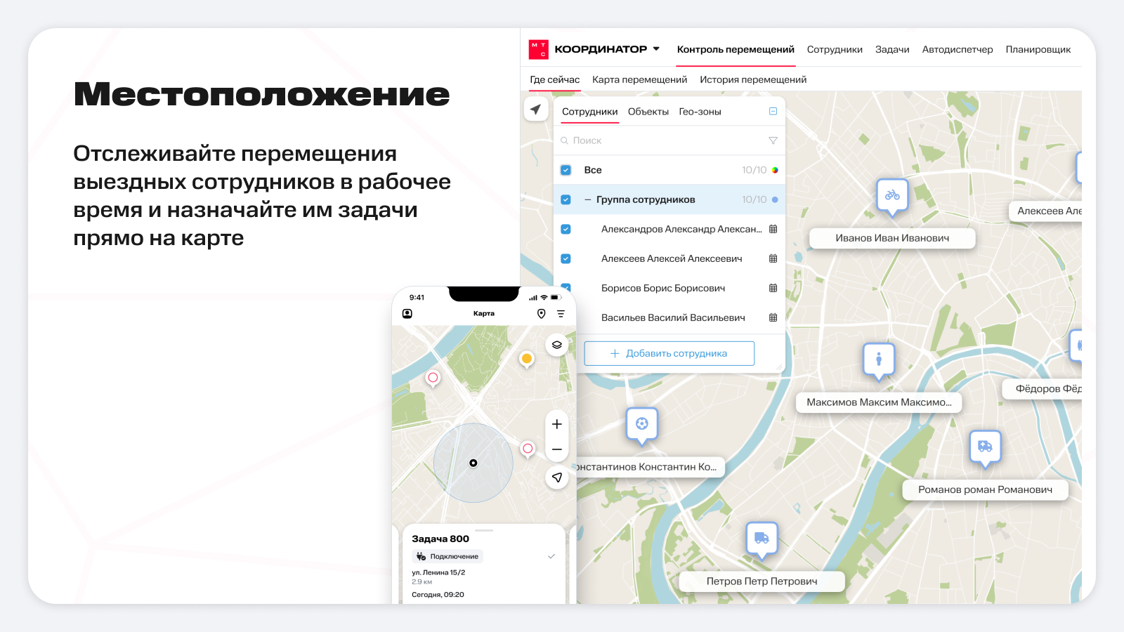 «Мобильные сотрудники» предназначены для управления выездным персоналом. Система предоставляет возможность планирования задач и маршрутов, назначения исполнителей, контроля их перемещений и хода работ, а также внесения оперативных изменений. Работает на мобильных устройствах с iOS и Android.