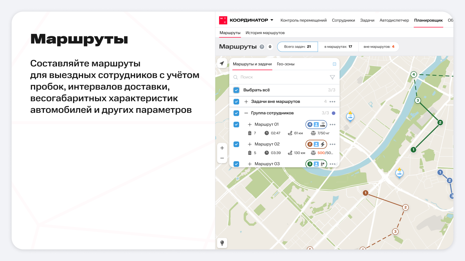 Автоматическое планирование маршрутов учитывает комплекс параметров: время в пути до адреса с учетом пробок, время выполнения и приоритет задачи, компетенции сотрудников, гео-зоны задачи, интервал, удобный для клиента.