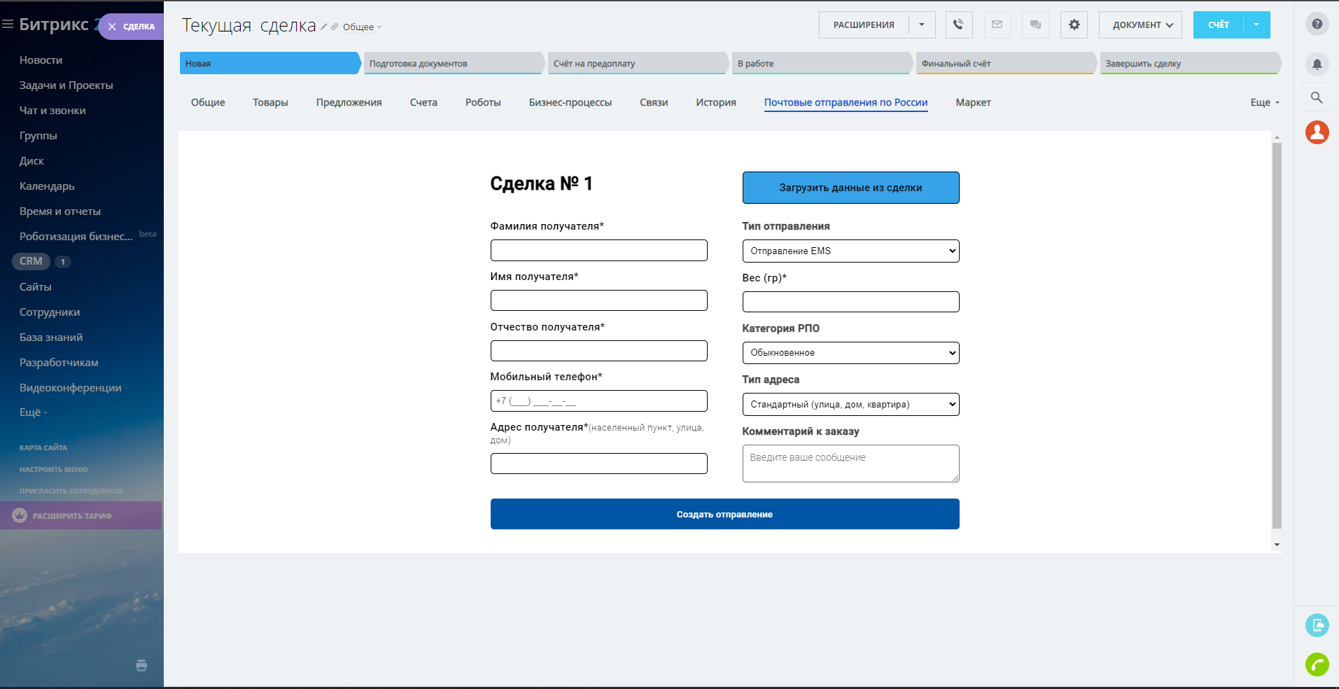 - Автоматическая загрузка данных из полей в сделках (адрес, тип отправления и т.д.) в личный кабинет аккаунта Почты России ;