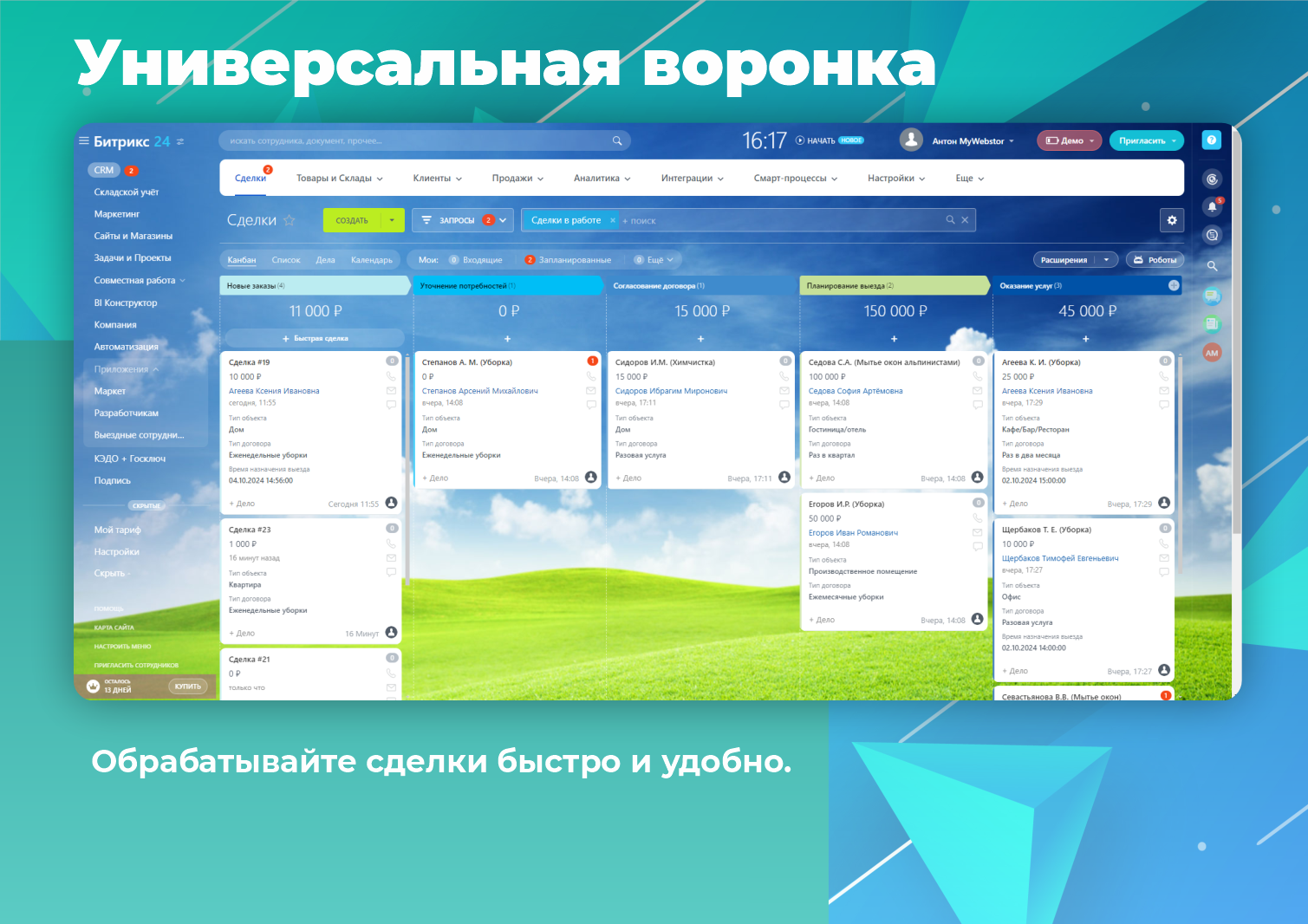 Преимущества решения CRM для клининга в Битрикс24 позволяет организовать работу как для офисных, так и для выездных сотрудников без необходимости установки дополнительного ПО.
