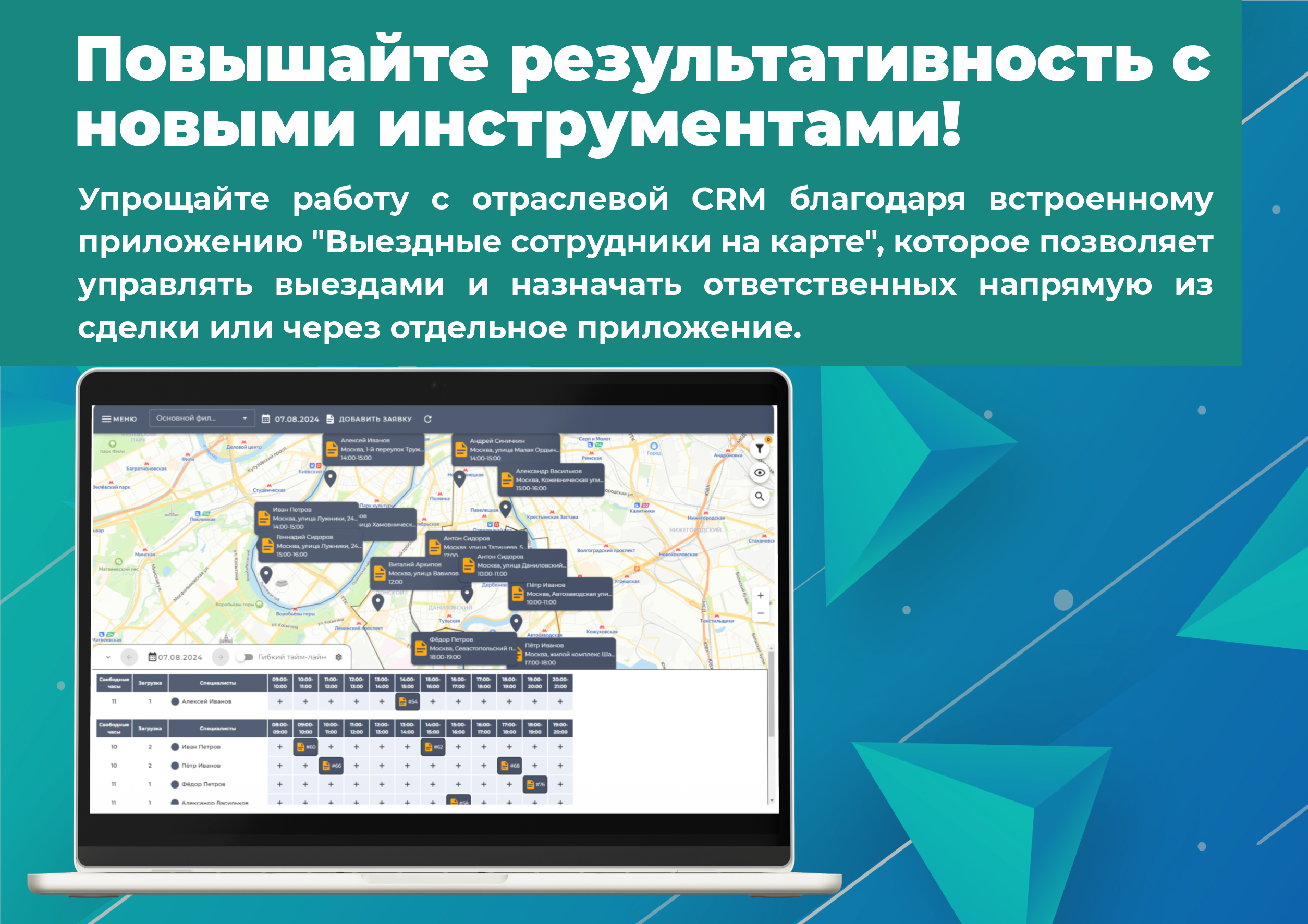 Данная система помогает повысить эффективность работы с заявками, улучшить контроль выездных сотрудников и качество предоставляемых услуг.
