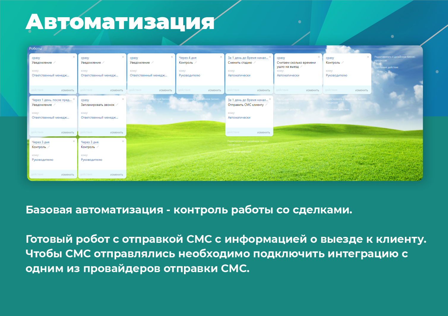 Готовый робот для отправки SMS клиентам с информацией о предстоящем выезде, при этом необходимо подключение к SMS-провайдеру.