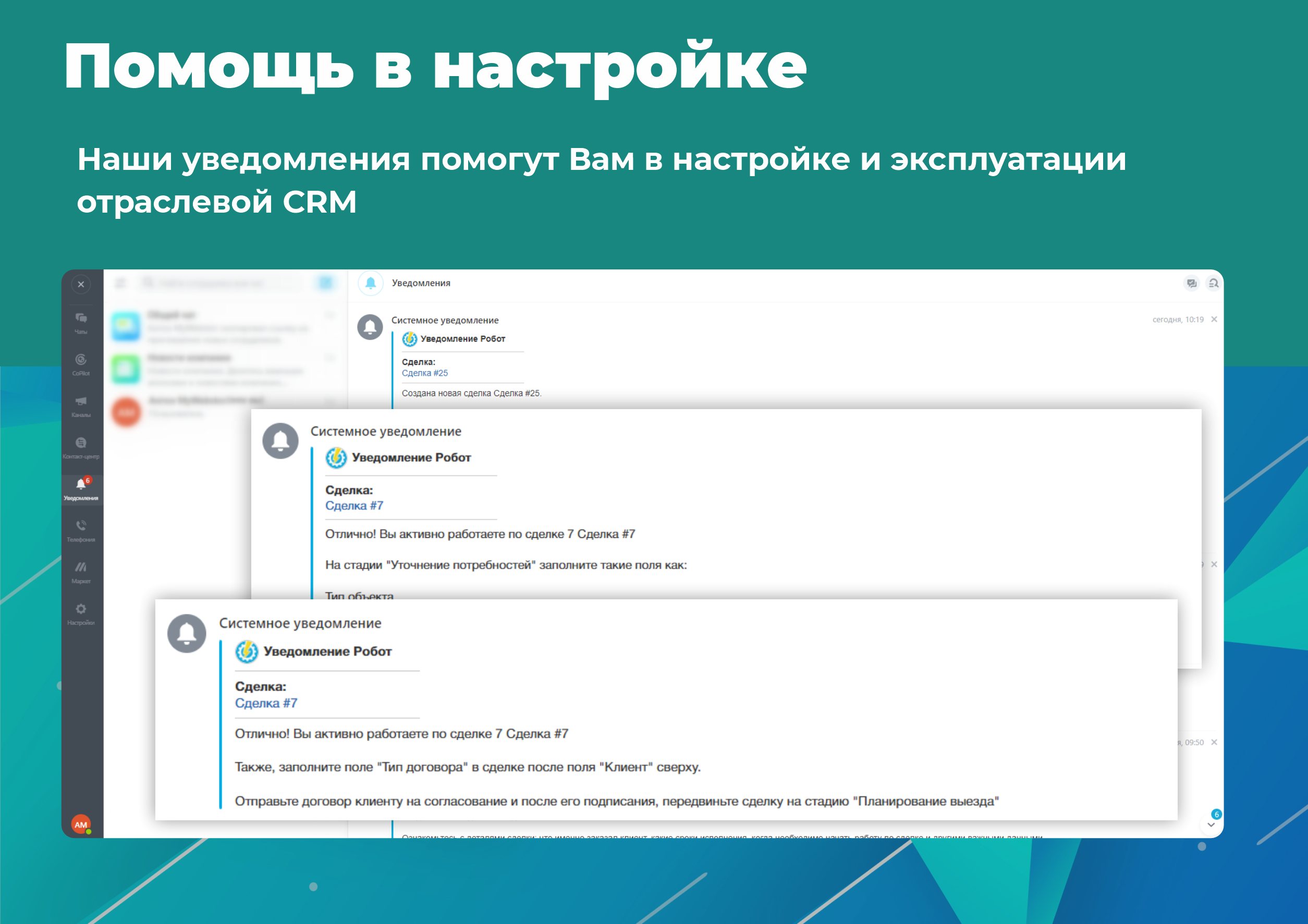 Автоматизация и уведомления в CRM настроены для процесса управления сделками, что включает:
