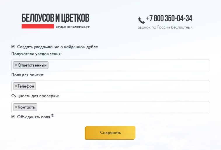 В случае нахождения дубля ответственному прилетит уведомление с ссылкой на данный контакт