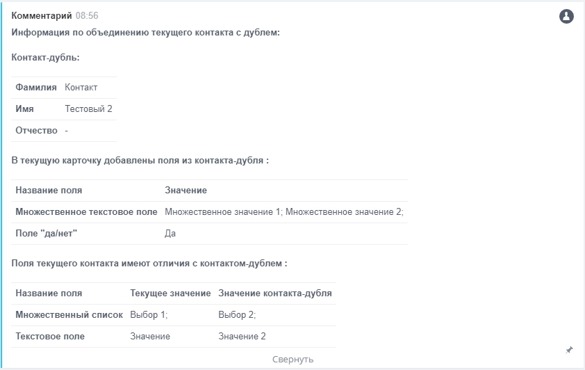 В случае, если поле заполнено в обоих карточках, то виджет присваивает одно значение , а в ленте карточки в виде комментария указывает, в каком поле какая была информация у оригинала и какая - у дубля. Происходит обогащение данных.