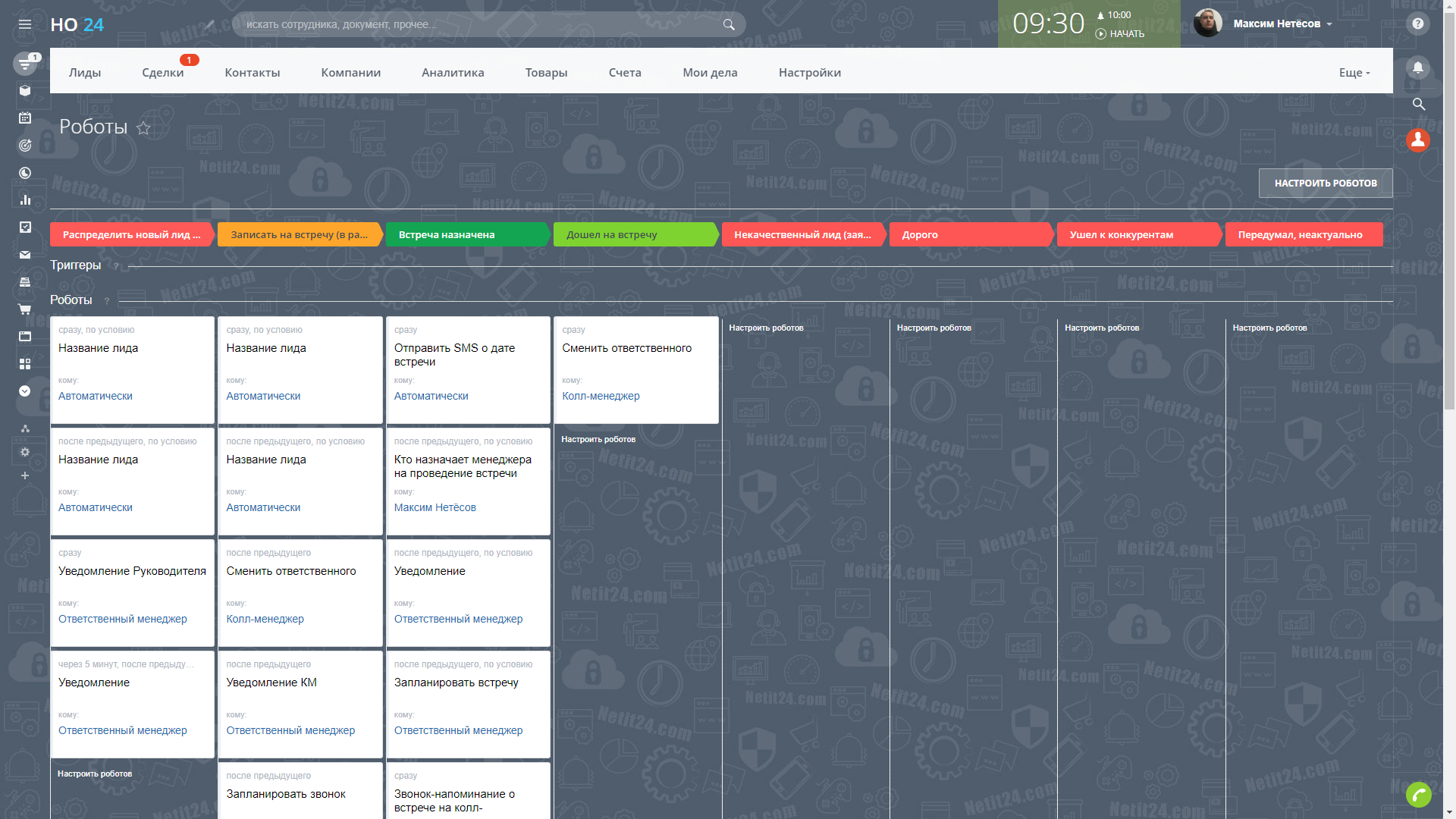 - роботы-уведомления на этапах поступления заявок/сделок по основным этапам работы с клиентами.