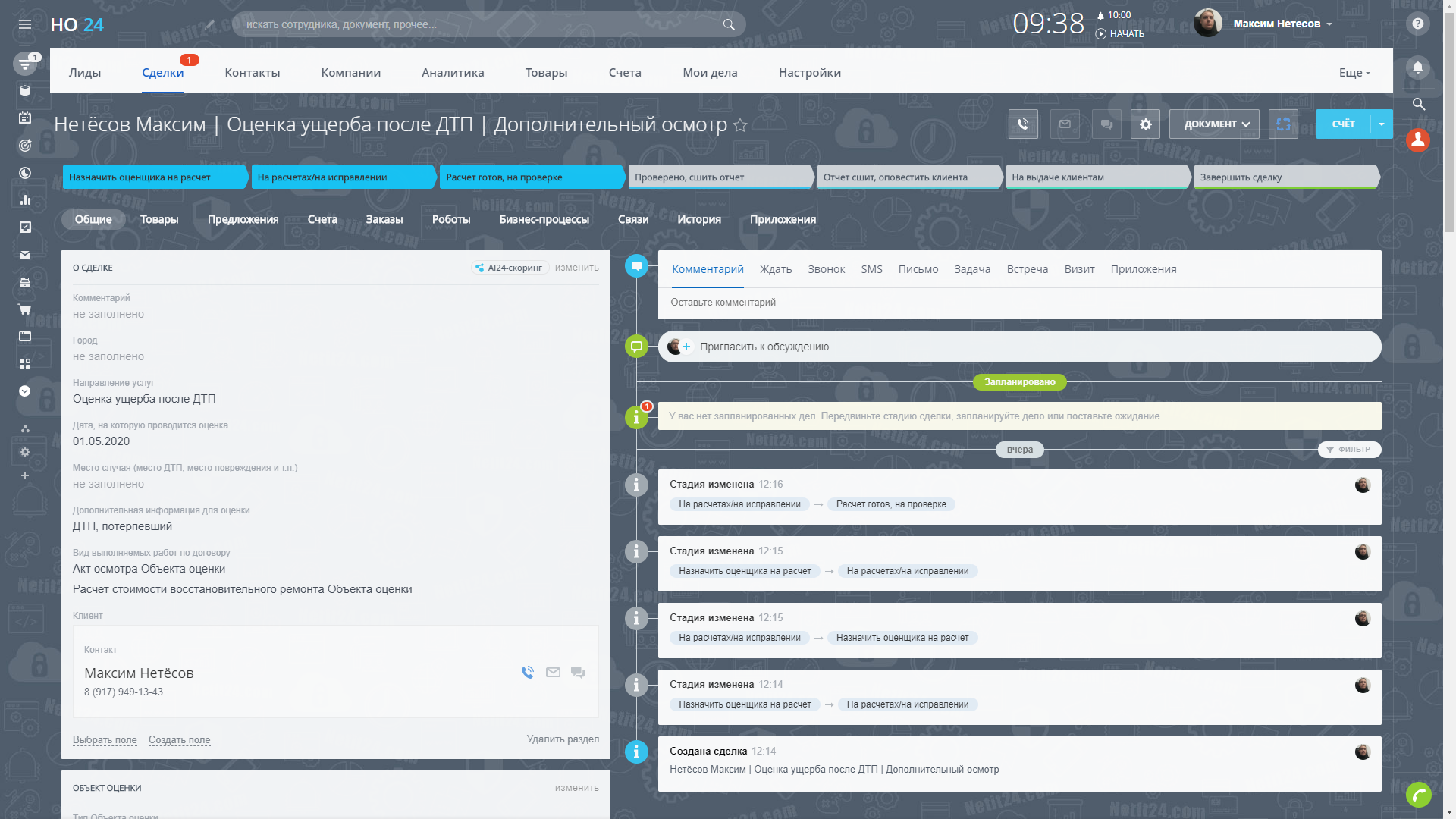 - Доступны пользовательские поля в воронке "Отдел продаж" - "Дата и время встречи", "Направление услуг", "Ценовая категория", "Город", "Дата, на которую проводится оценка", "Место случая (место ДТП, место повреждения и т.п.)", "Дополнительная информация для оценки", "Вид выполняемых работ по договору", "Колл-менеджер", "Менеджер по продажам", "Какие возражения клиента после встречи?", "Тип Объекта оценки", "Наименование Объекта оценки", "Дополнительные характеристики Объекта оценки (гос.номер ТС, кадастровый номер и т.п.)", "Собственник Объекта оценки", "Тип документа на право собственности", "Серия и номер документа на право собственности", "Кем выдан документ на право собственности", "Дата выдачи документа на право собственности", "Документы на Объект оценки (прикрепить)", "Местонахождение Объекта оценки", "Причинитель вреда", "Размер полученного возмещения ущерба", "Дата получения возмещения", "Страховщик", "Страховой полис (по которому получаем выплату)", "Лимит страховой выплаты по полису", "Страховой полис (прикрепить скан - при наличии)"