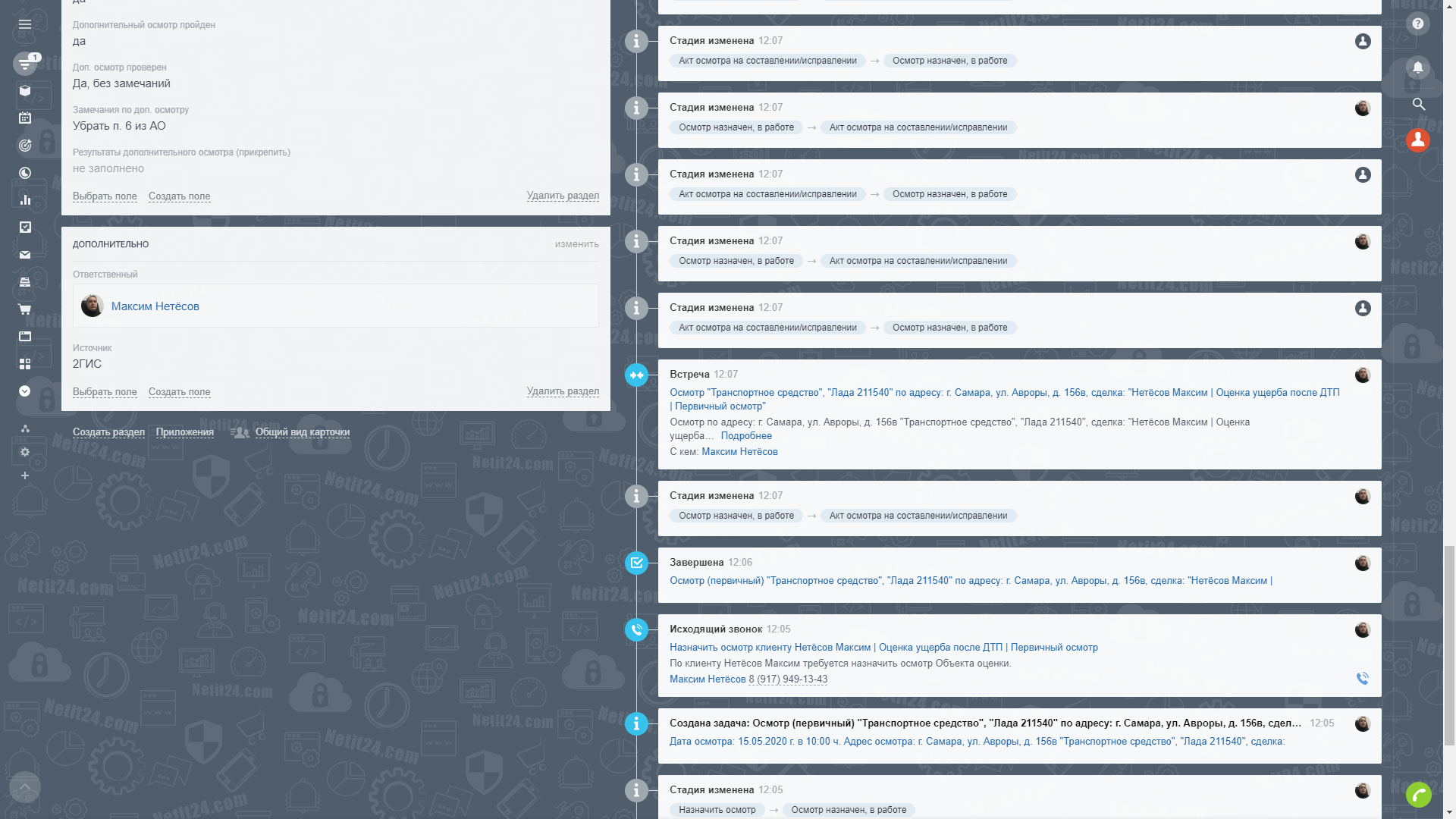 - Доступны пользовательские поля в воронке "Проведение осмотров" - "Направление услуг", "Город", "Дата, на которую проводится оценка", "Место случая (место ДТП, место повреждения и т.п.)", "Дополнительная информация для оценки", "Вид выполняемых работ по договору", "Папка с документами по делу клиента", "Тип Объекта оценки", "Наименование Объекта оценки", "Дополнительные характеристики Объекта оценки (гос.номер ТС, кадастровый номер и т.п.)", "Собственник Объекта оценки", "Тип документа на право собственности", "Серия и номер документа на право собственности", "Кем выдан документ на право собственности", "Дата выдачи документа на право собственности", "Местонахождение Объекта оценки", "Документы на Объект оценки (прикрепить)", "Оценщик первичного осмотра", "Дата и время первичного осмотра", "Адрес первичного осмотра", "Уведомление о первичном осмотре отправлено", "Первичный осмотр пройден", "Дополнительный осмотр требуется?", "Первичный осмотр проверен", "Замечания по первичному осмотру", "Результаты первичного осмотра (прикрепить)", "Оценщик дополнительного осмотра", "Дата и время дополнительного осмотра", "Адрес дополнительного осмотра", "Уведомление о дополнительном осмотре отправлено", "Дополнительный осмотр пройден", "Доп. осмотр проверен", "Замечания по доп. осмотру", "Результаты дополнительного осмотра (прикрепить)".