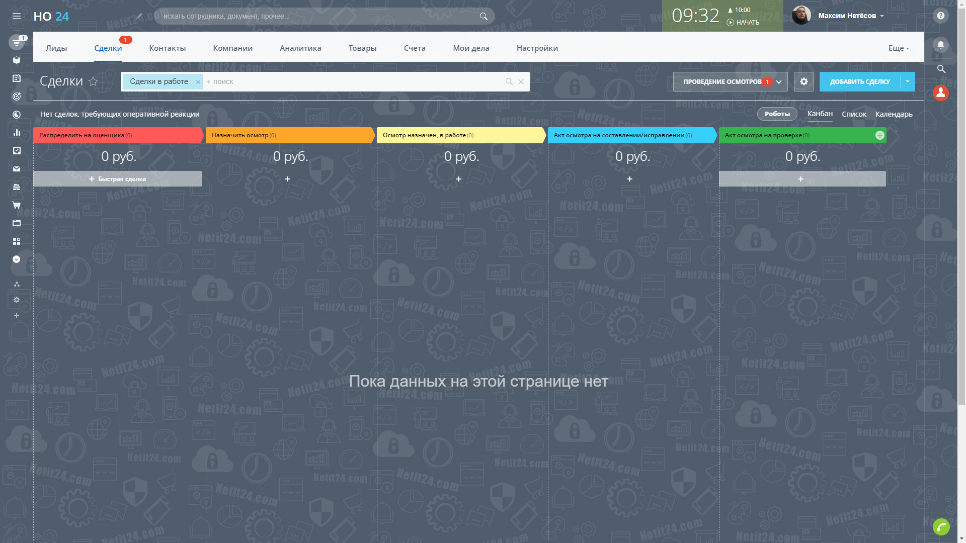 - Доступна воронка "Проведение осмотров" (стадии - "Распределить на оценщика", "Назначить осмотр", "Осмотр назначен, в работе", "Акт осмотра на составлении/исправлении", "Акт осмотра на проверке") - для полного контроля работы оценщиков, проводящих осмотр Объекта оценки;