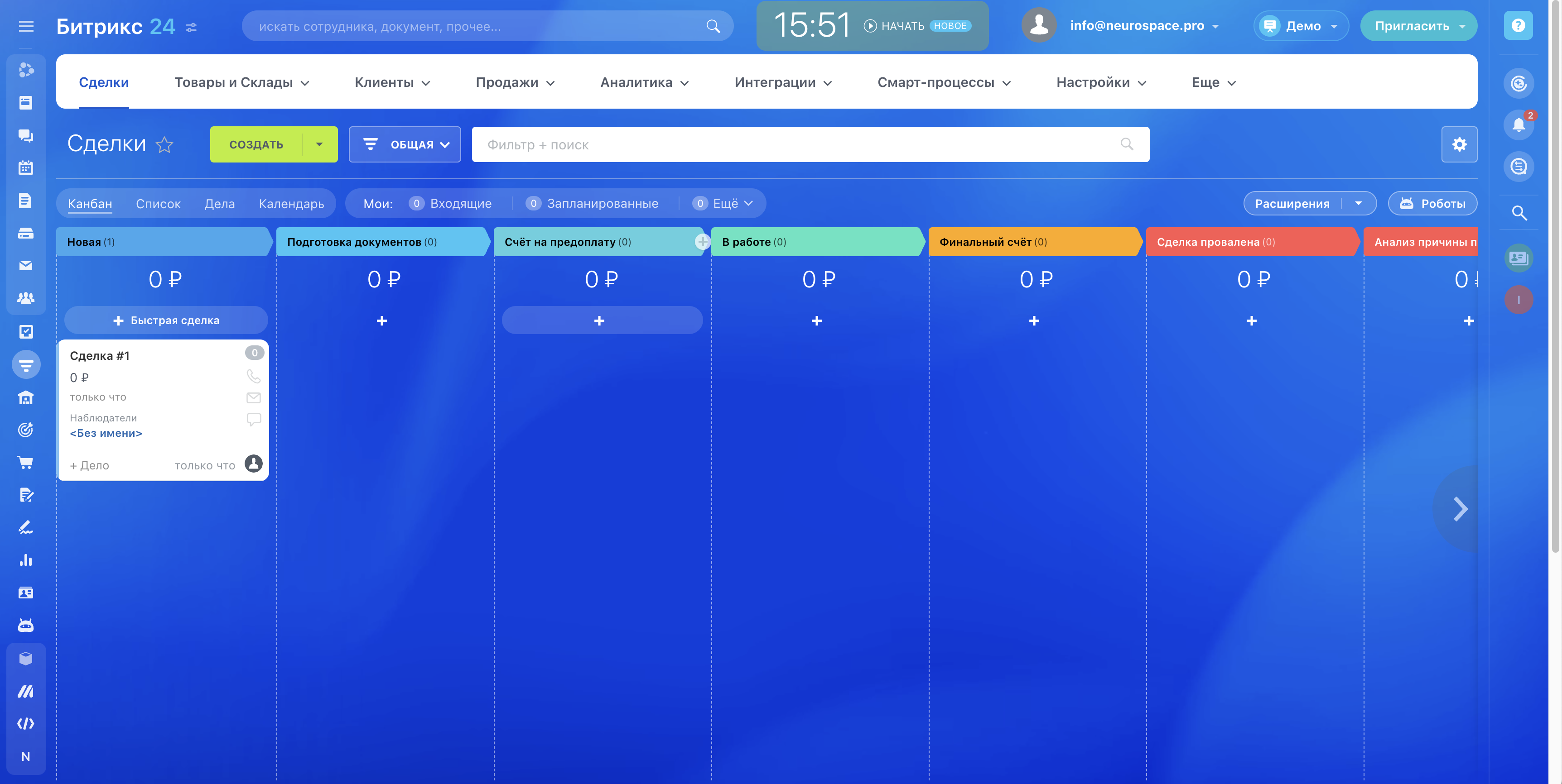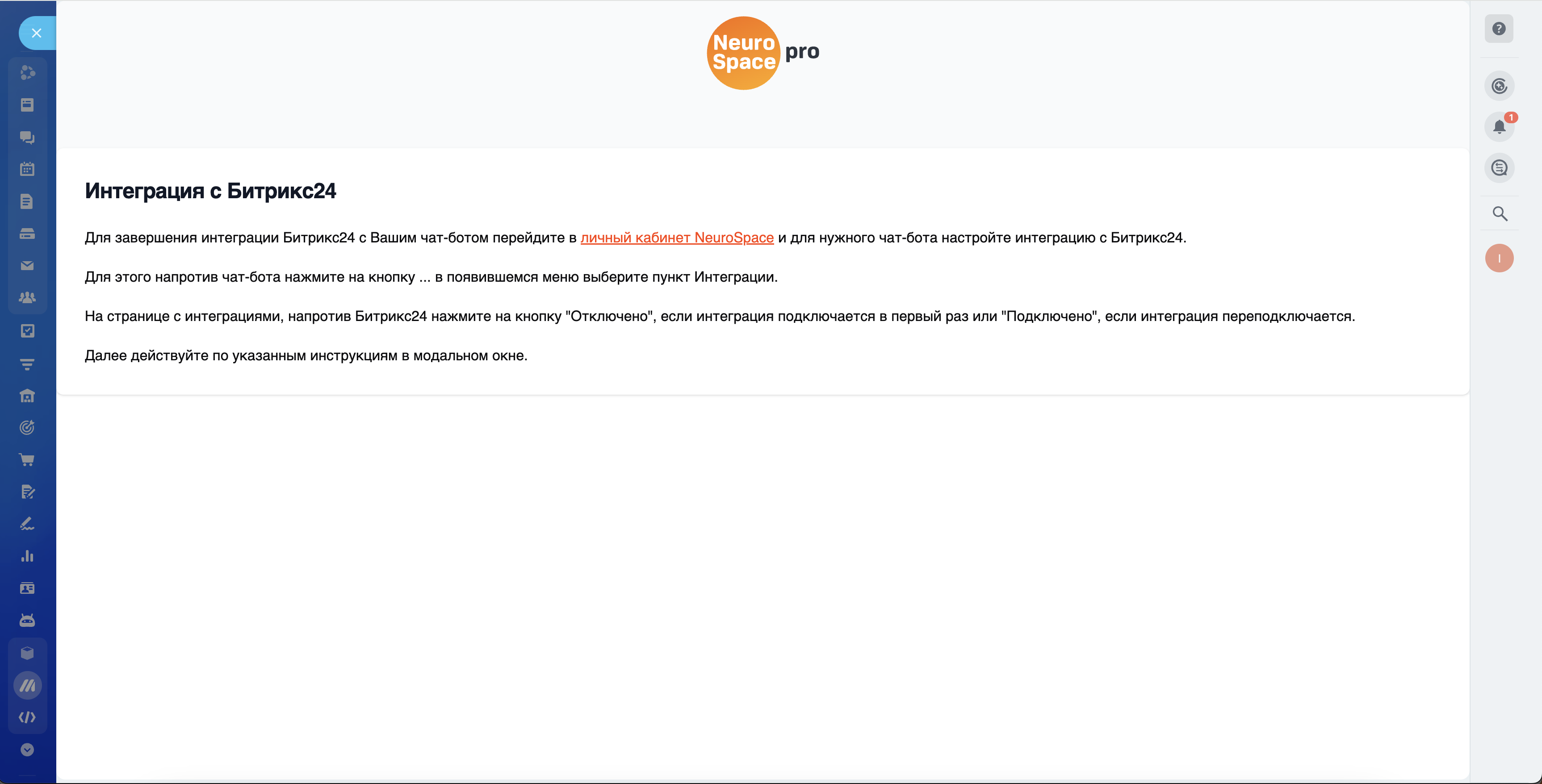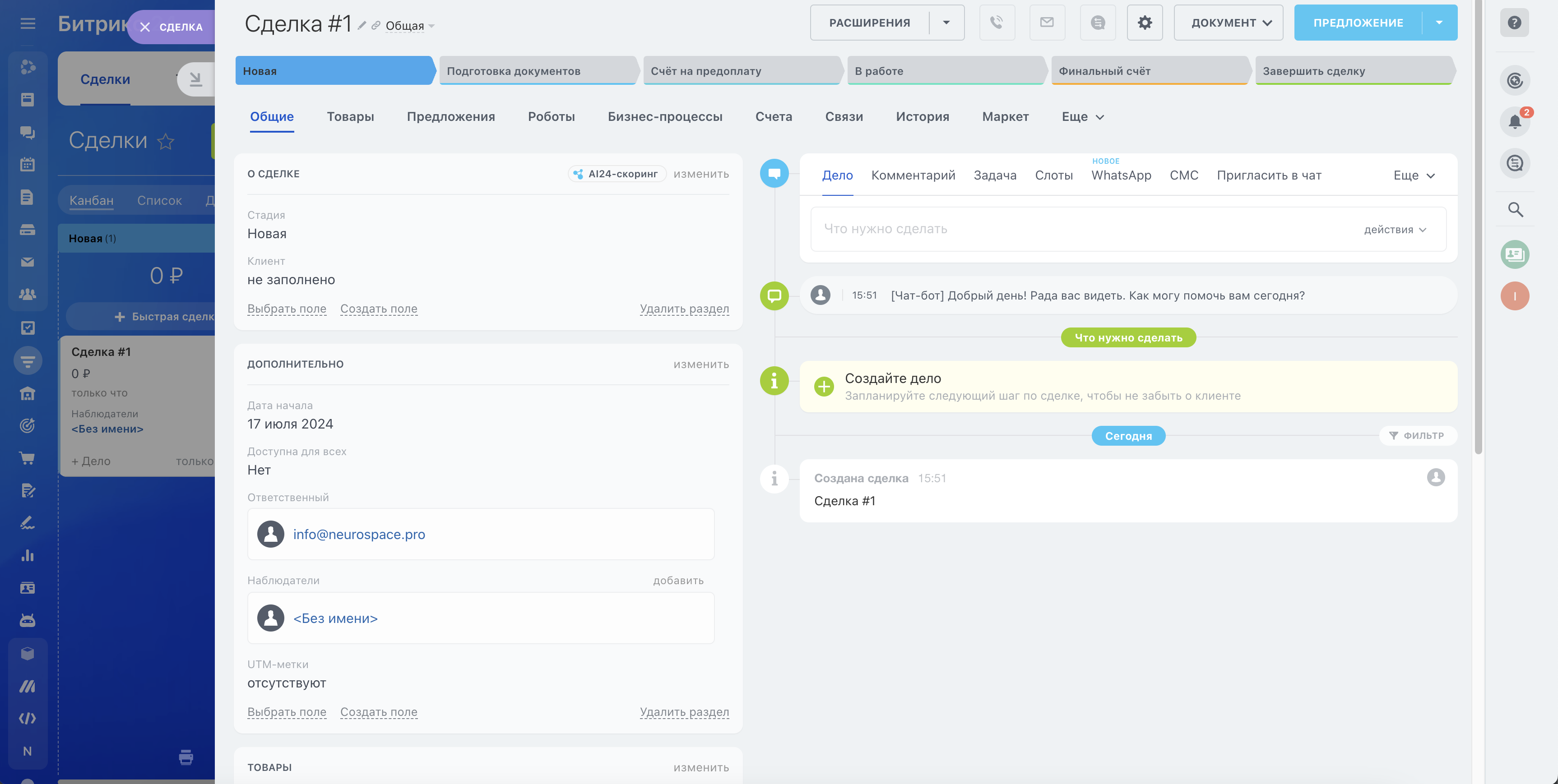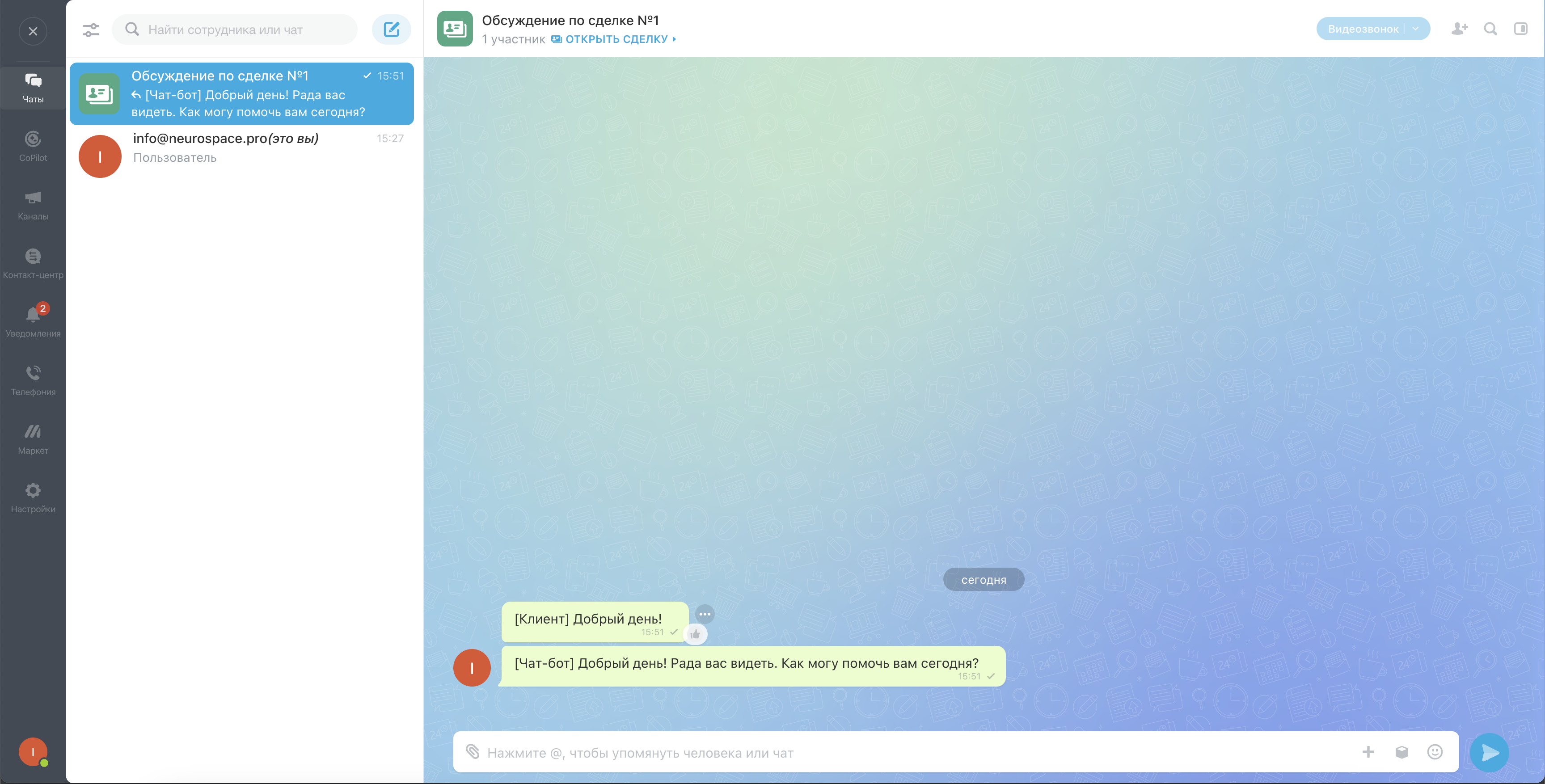 Интеграция с Битрикс24 позволяет передавать диалоги из NeuroSpace в виде сделок в Битрикс24 в разделе CRM, переписка сохраняется в чате, закрепленном за данной сделкой.