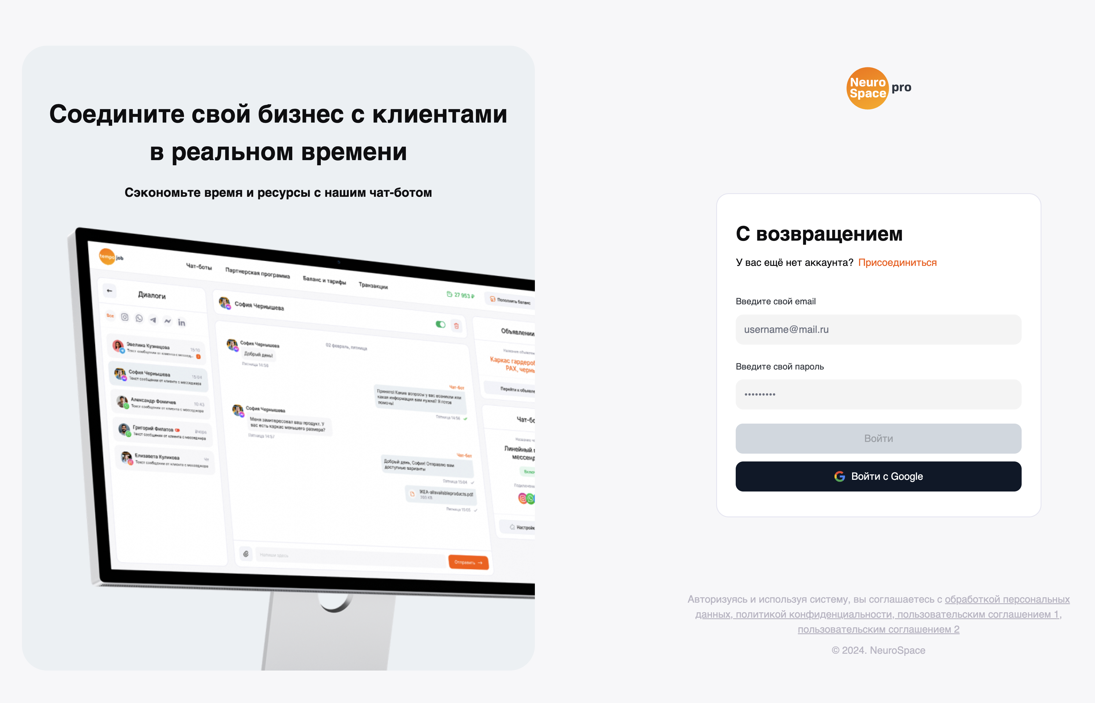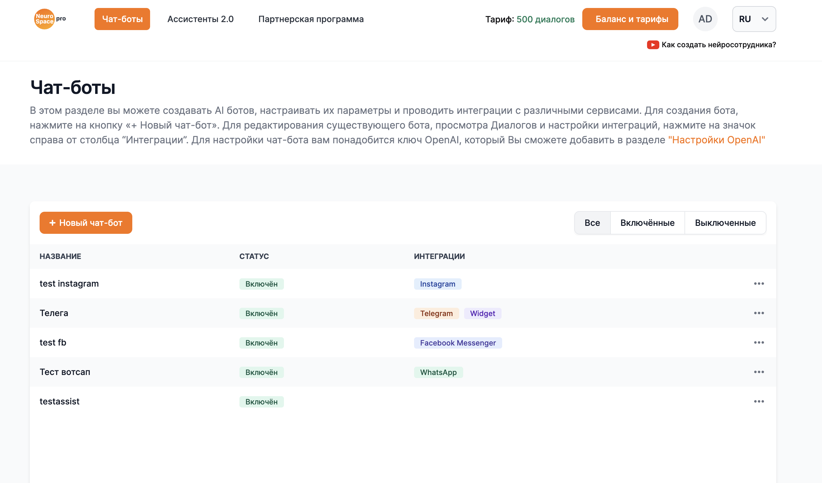 NeuroSpace - ваш универсальный маркетплейс для создания чат-ботов на базе chatGPT и интеграции с популярными платформами, такими как Авито, Инстаграм*, Telegram и Whatsapp. Наш маркетплейс предоставляет возможность создавать интеллектуальных чат-ботов с помощью передовых технологий NeuroSpace и интегрировать их с различными платформами для эффективного взаимодействия с клиентами.