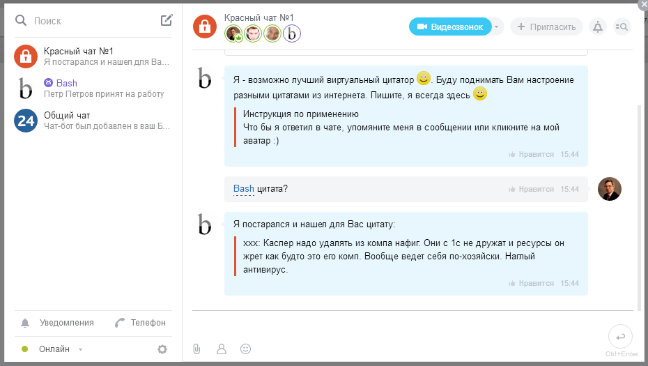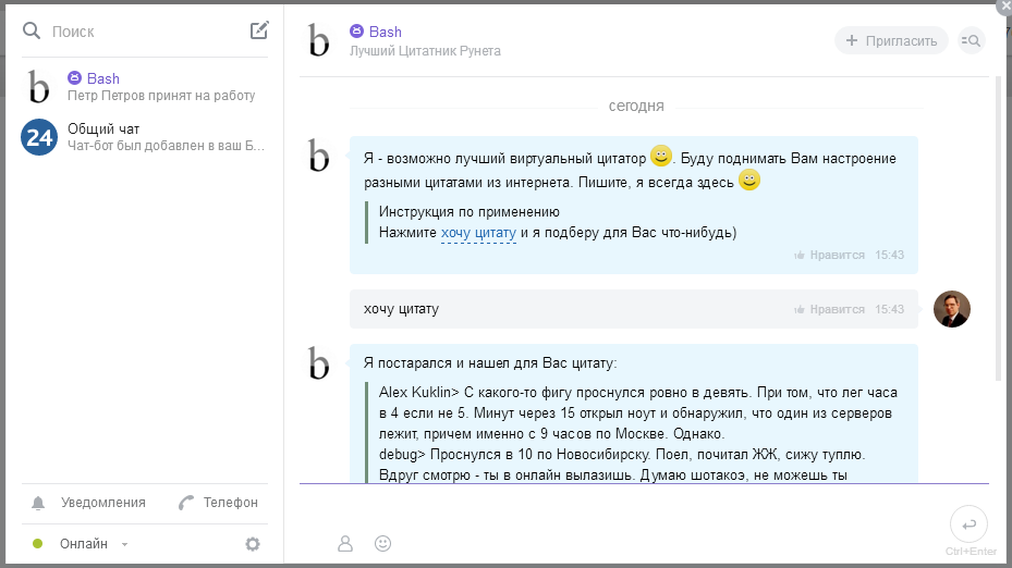 Стандартная процедура установки. После установки приложения новый бот даст о себе знать в общем чате компании. Напишите ему лично - и он ответит цитатой. Пригласите в чат, упомяните в сообщении или кликните на аватар - и он ответит цитатой в чате.