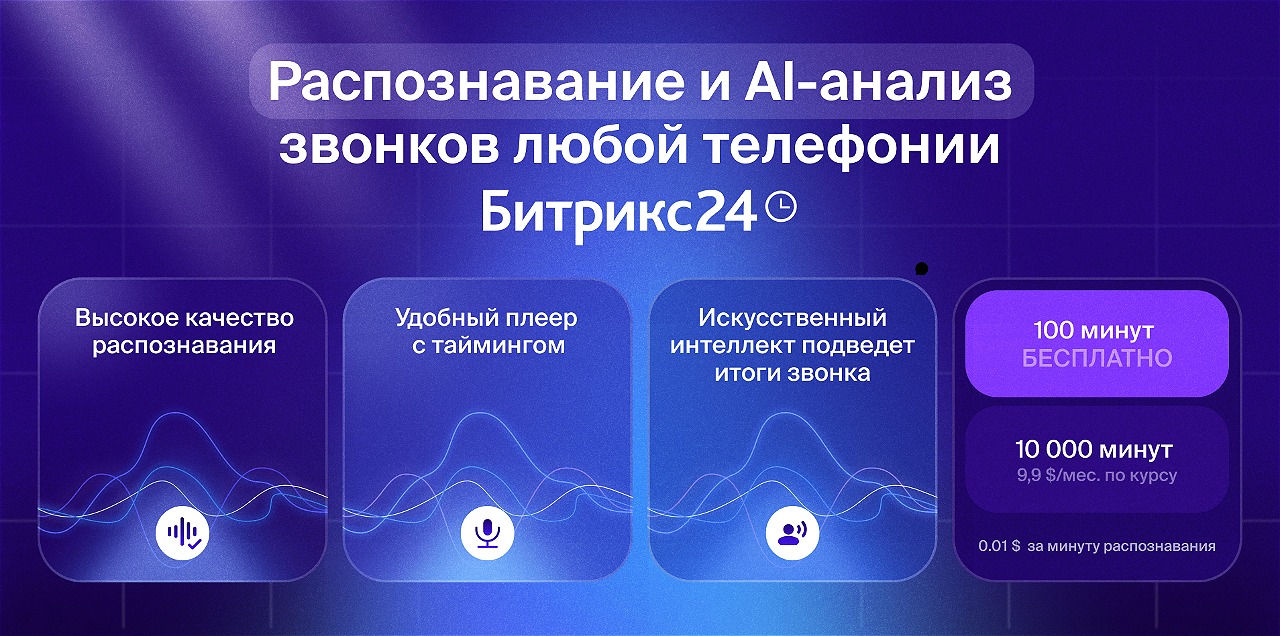Распознавание звонка и создание текстовой расшифровки (транскрипт). Работает с любой телефонией, интегрированной в Битрикс24 с включенной функцией прикрепления звукозаписи.
