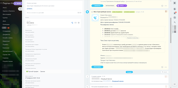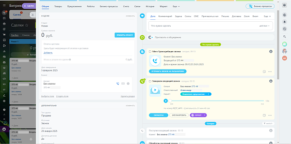 Распознавание и создание текстовой расшифровки звонков (транскрипт). Работает с любой телефонией, интегрированной в Битрикс24 с включенной функцией прикрепления звукозаписи. Если вы можете прослушать звонок в Битрикс24, приложение сможет расшифровать его в текст.