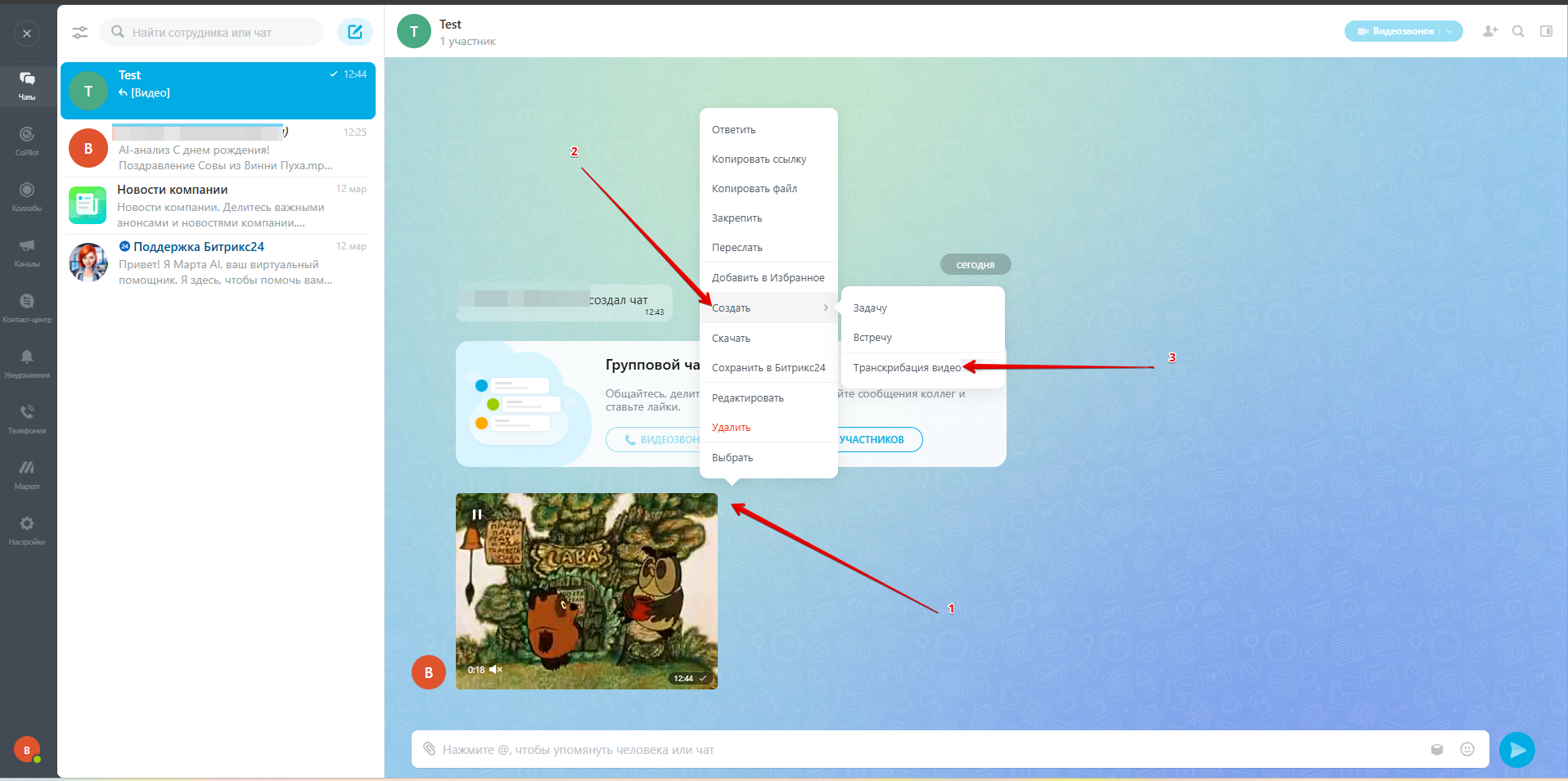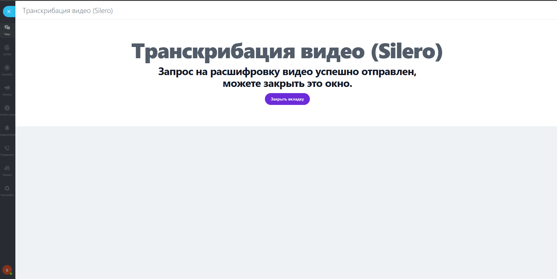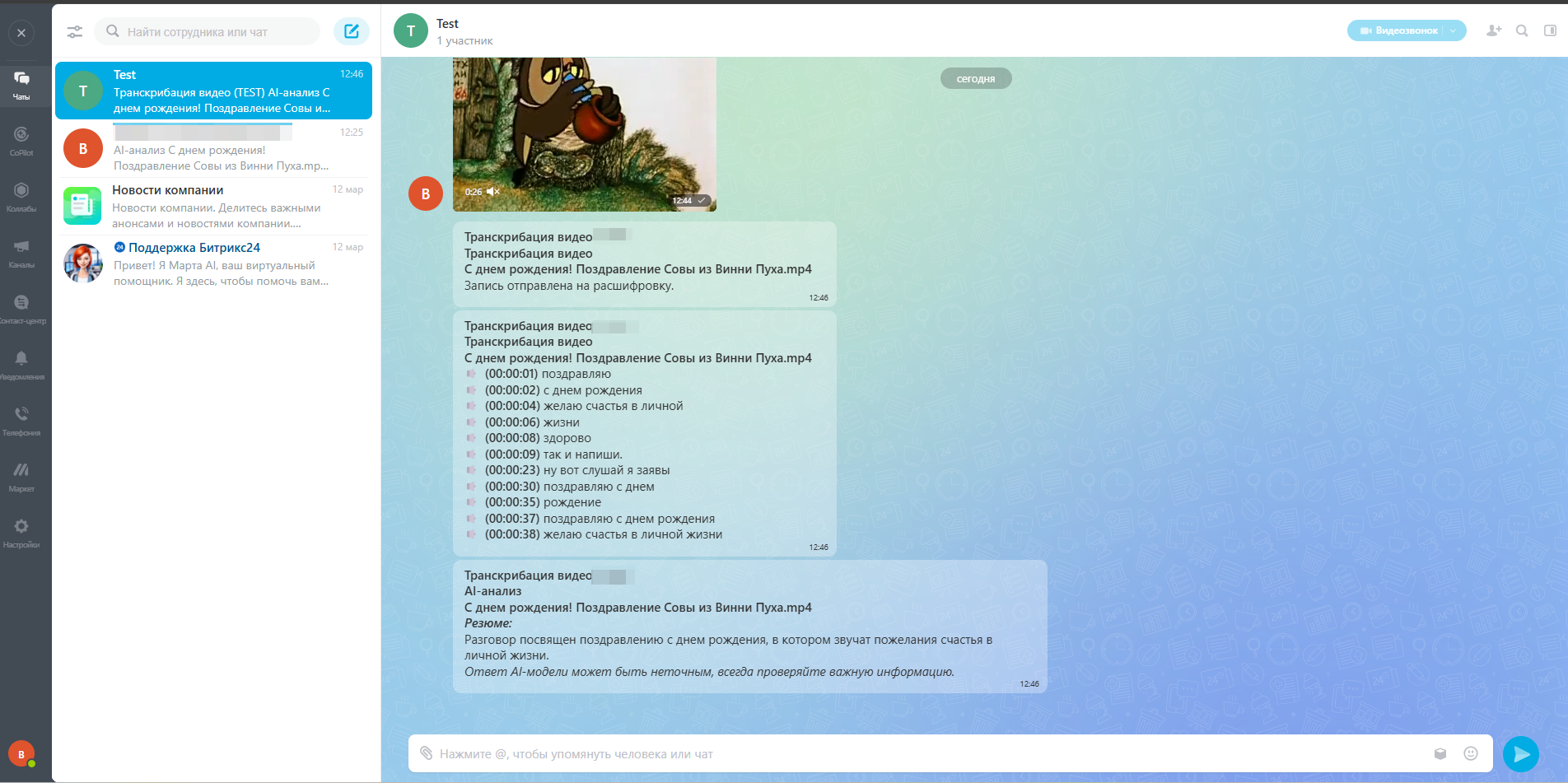 Когда вы добавляете запись видеозвонка в чат, становится доступна функция преобразования видео в текст, а также проведения анализа беседы. Достаточно запустить приложение прямо из контекстного меню сообщения, и результаты обработки будут автоматически добавлены в тот же чат.