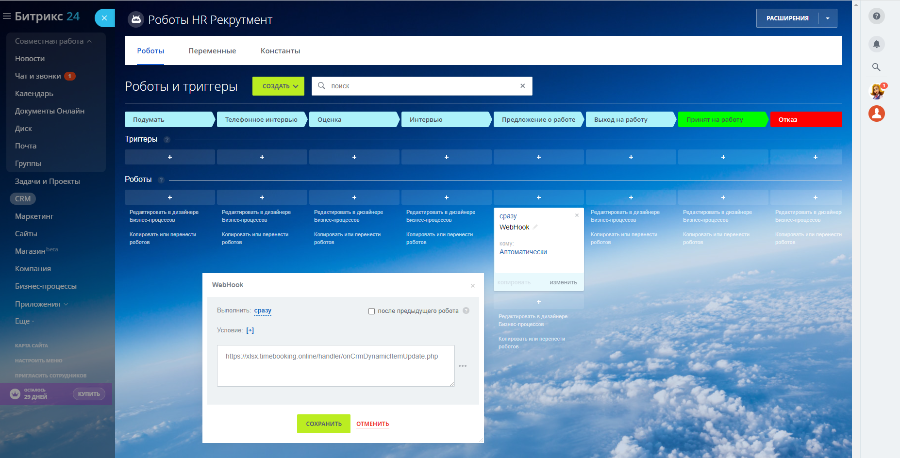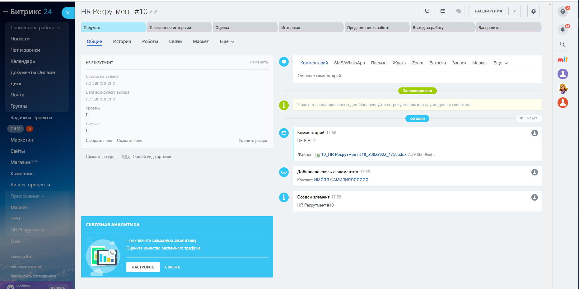 После передвижения элемента смарт-процесса в стадию, в которой установлен вебхук, создаётся комментарий , который содержит xlsx файл с набором полей элемента смарт-процесса.