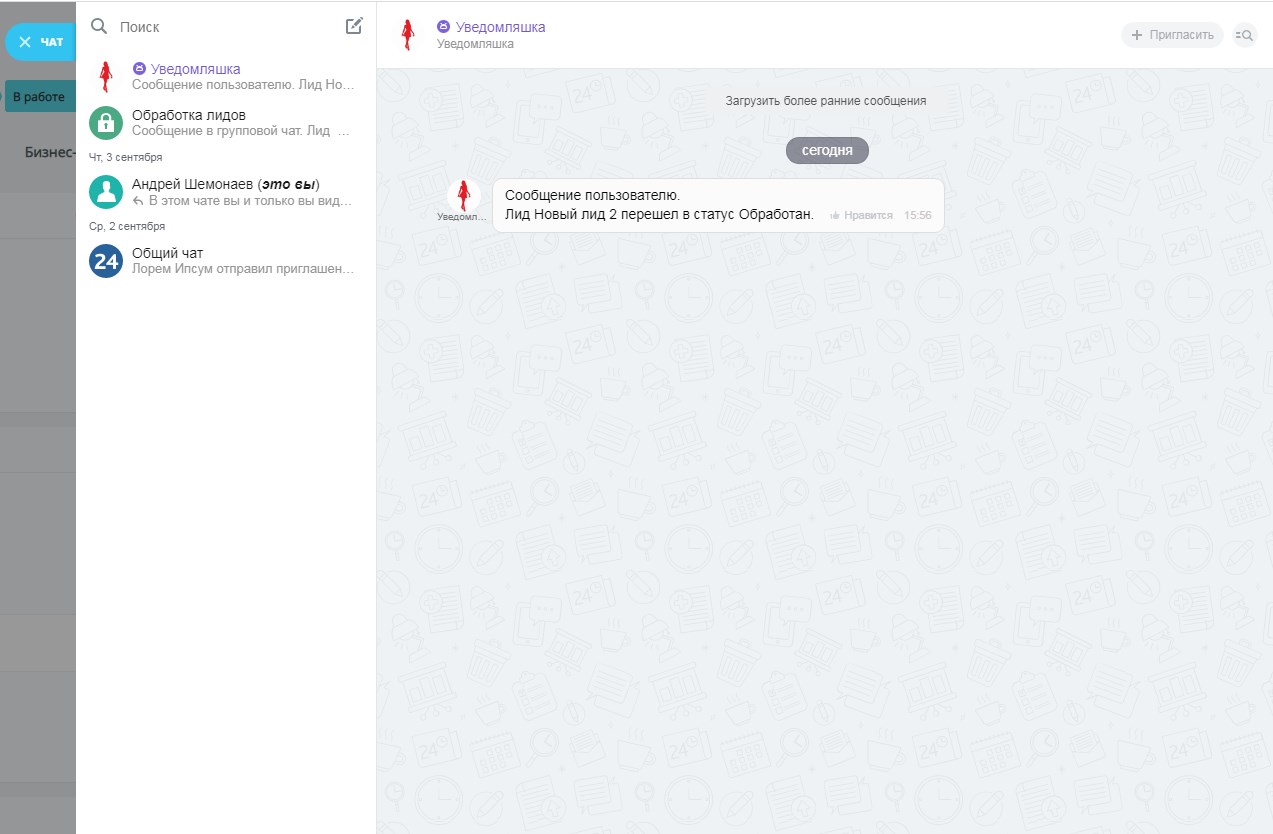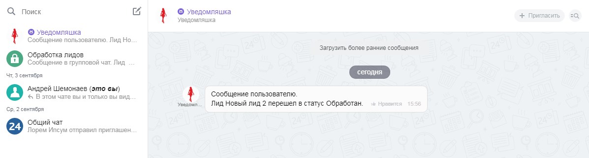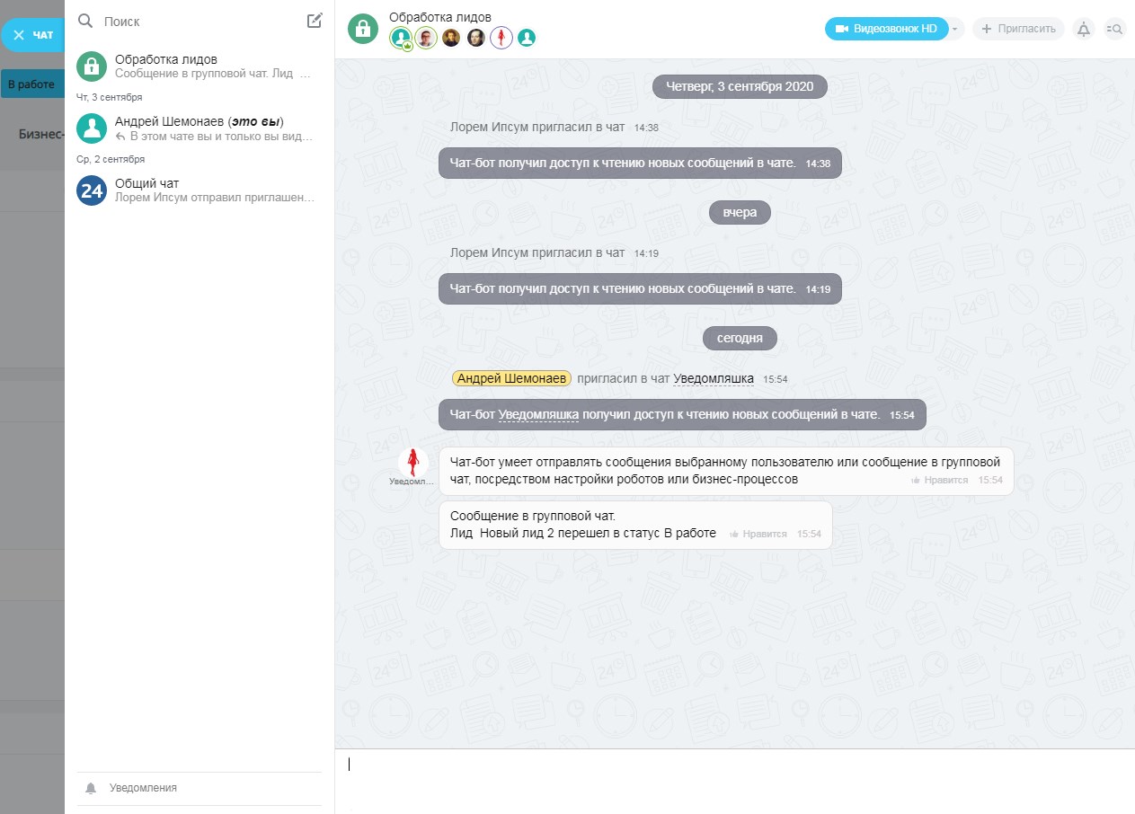 Казалось бы, что Битрикс уже умеет посылать информационные сообщения в «Колокольчик» или живую ленту. Но что делать, если нужно отправить сообщение конкретному получателю (группе получателей), или если необходимо рассортировать сообщения на различные темы по специально созданным тематическим чатам. Представьте насколько удобнее сотруднику посмотреть сообщения по своим сделкам в специальном чате, чем выискивать их в «Уведомлениях» («Колокольчике») среди нагромождения всех остальных.