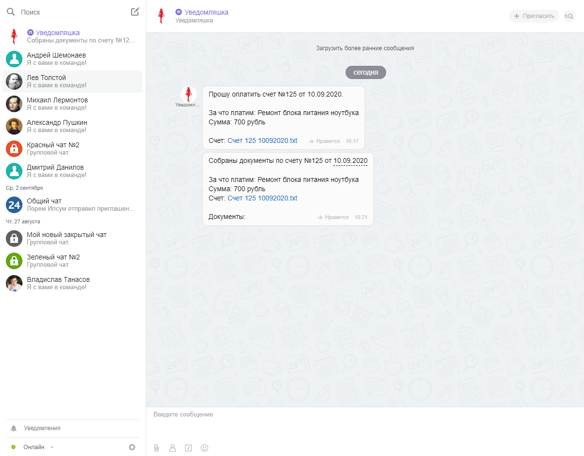 Позволяет в удобном виде получать уведомления от чат-бота. Доступно использование роботов и бизнес-процессов. Чат-бот умеет отправлять сообщения выбранному пользователю или сообщение в групповой чат.