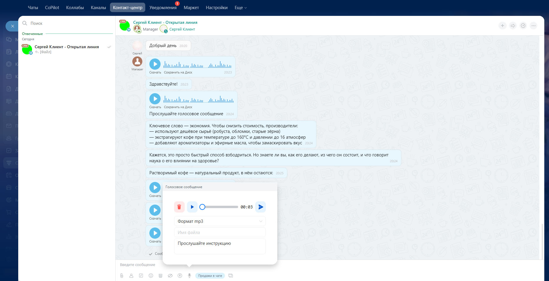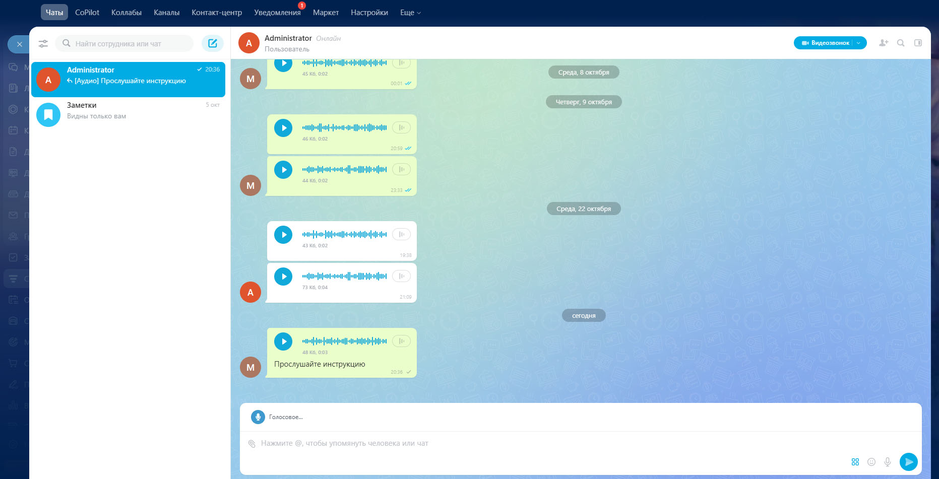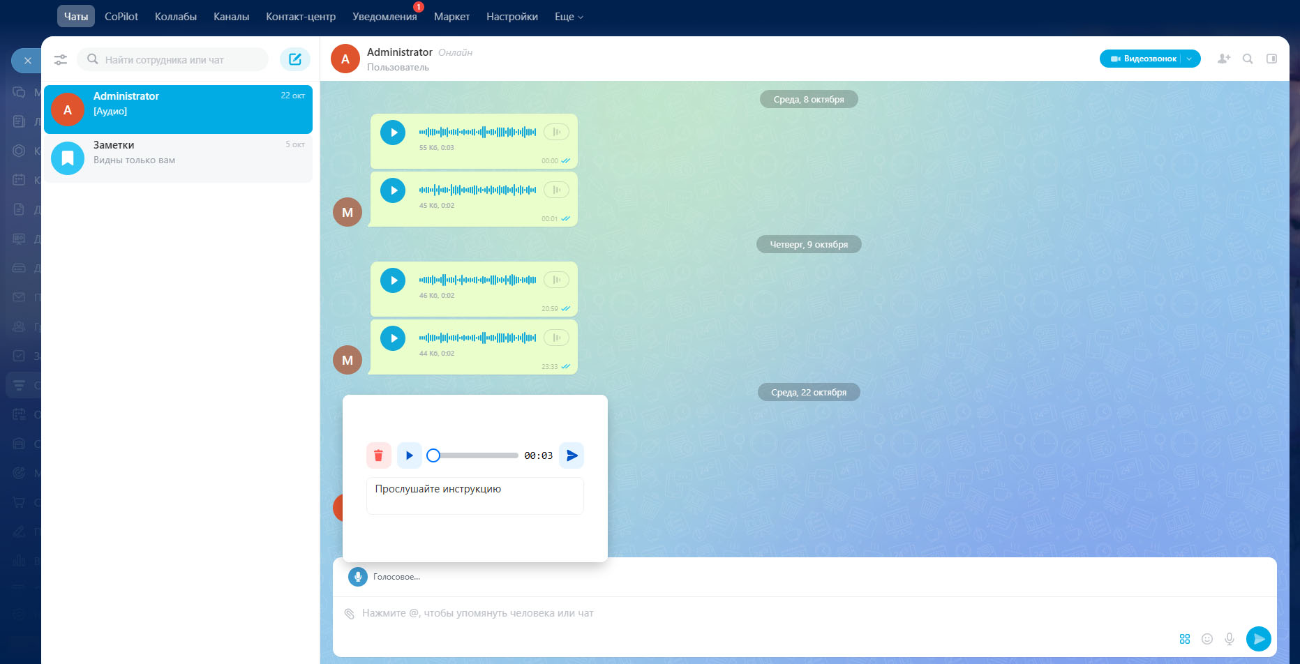 Удобный инструмент для быстрой коммуникации внутри Битрикс24. Позволяет записывать и отправлять голосовые сообщения вместо набора текста.