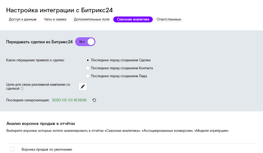 Интеграция с Битрикс24 позволяет построить полноценную сквозную аналитику по воронке продаж. Вы сможете оценить весь путь пользователя от рекламы до заключения сделки.