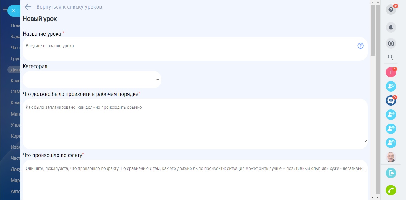 - Связка уроков с задачами Вашего Битрикс24. Каждая предложенное улучшение в уроке трансформируется в одну или несколько задач с ответственными и сроками - утвержденные уроки не останутся не внедрёнными.