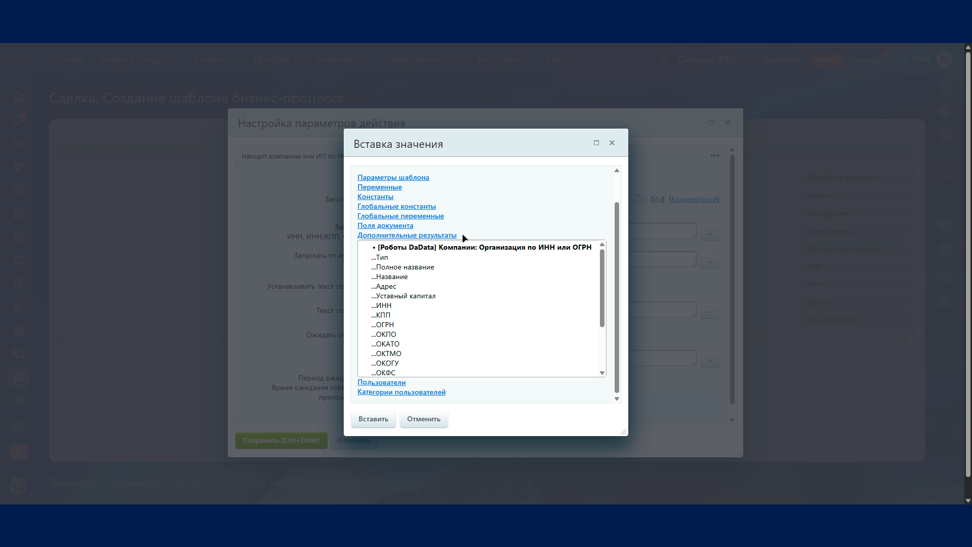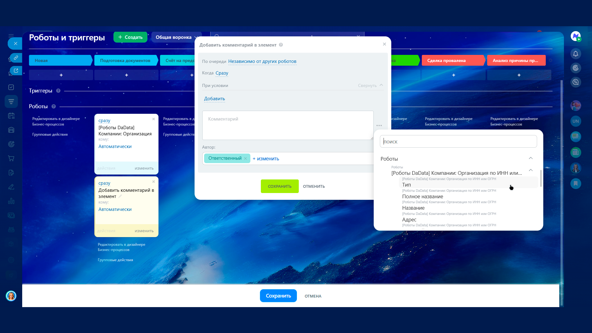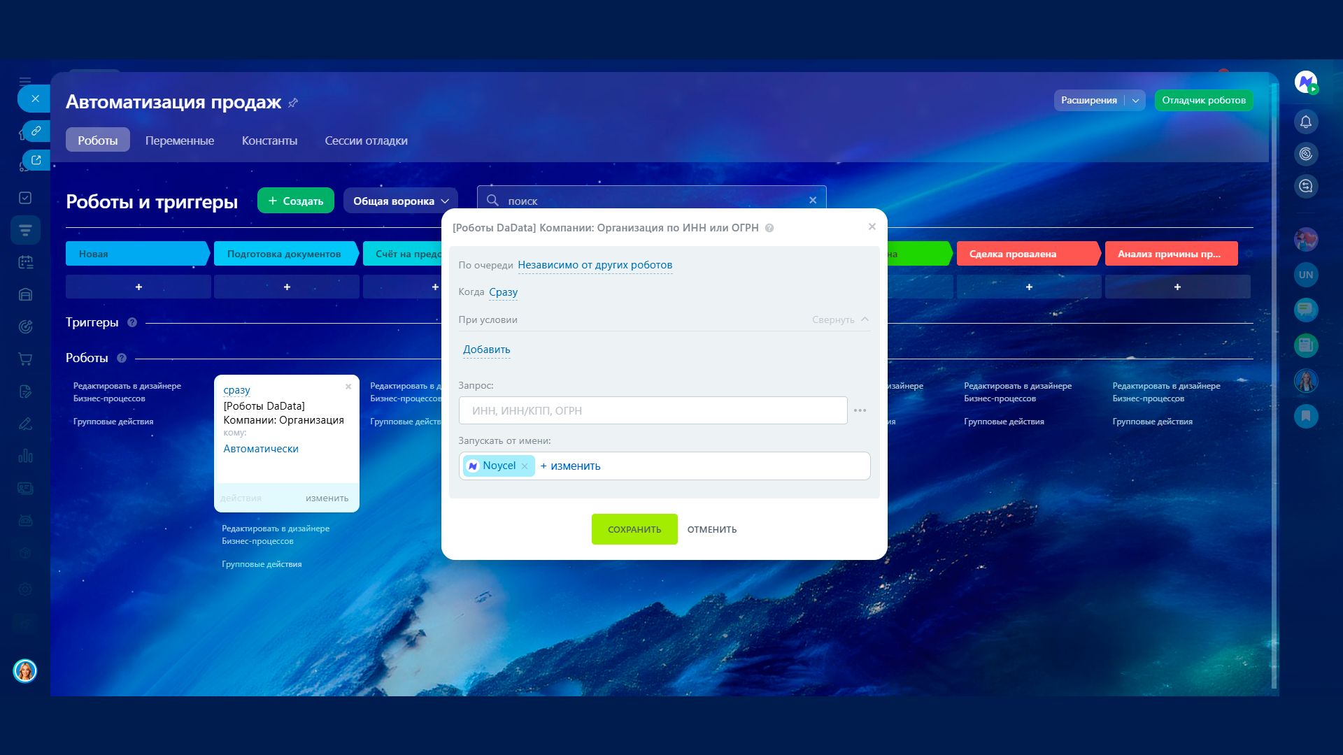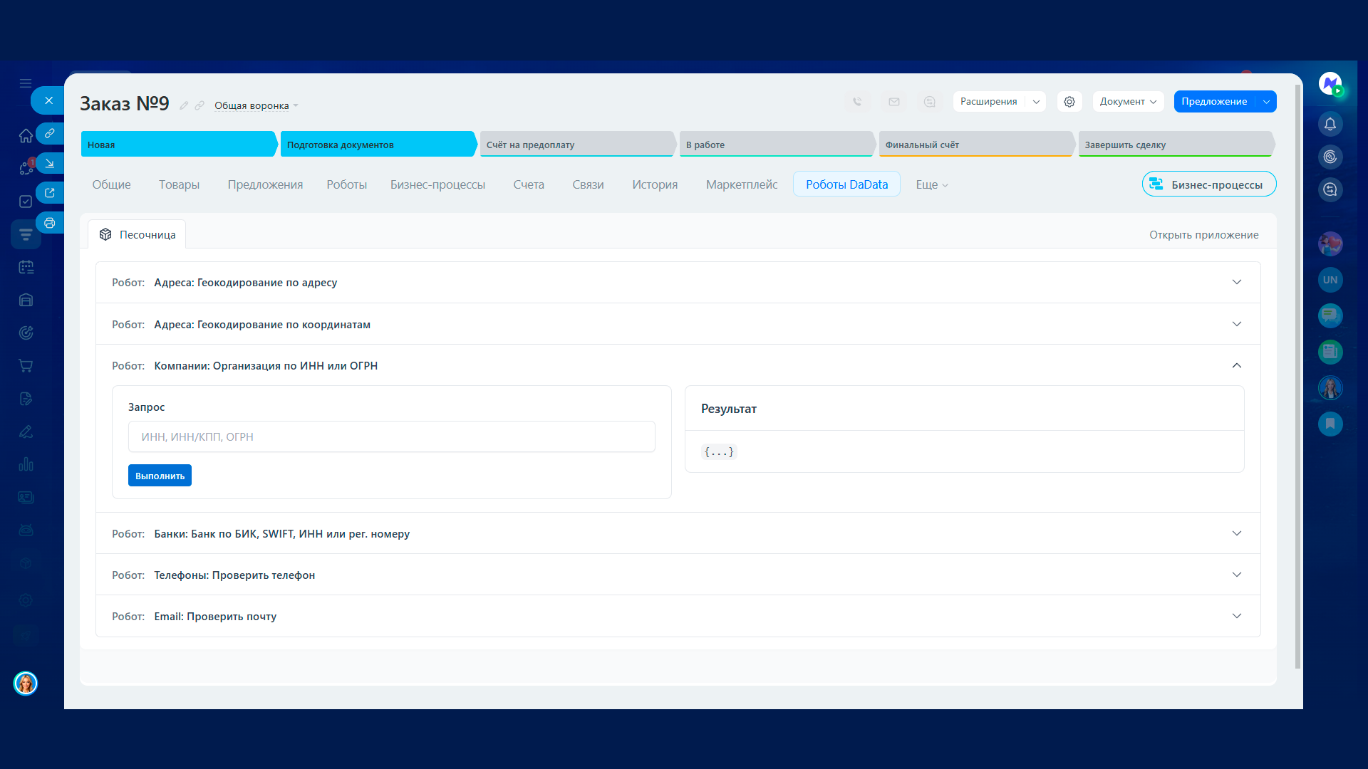 - Действия: робот "Организация по ИНН" подтягивает юридическое название, реквизиты и юридический адрес; робот "Проверить телефон" вносит корректный формат, определяет оператора и часовой пояс; робот "Проверить почту" исправляет опечатку в email.