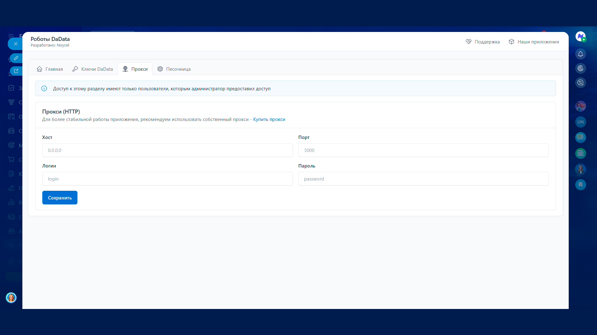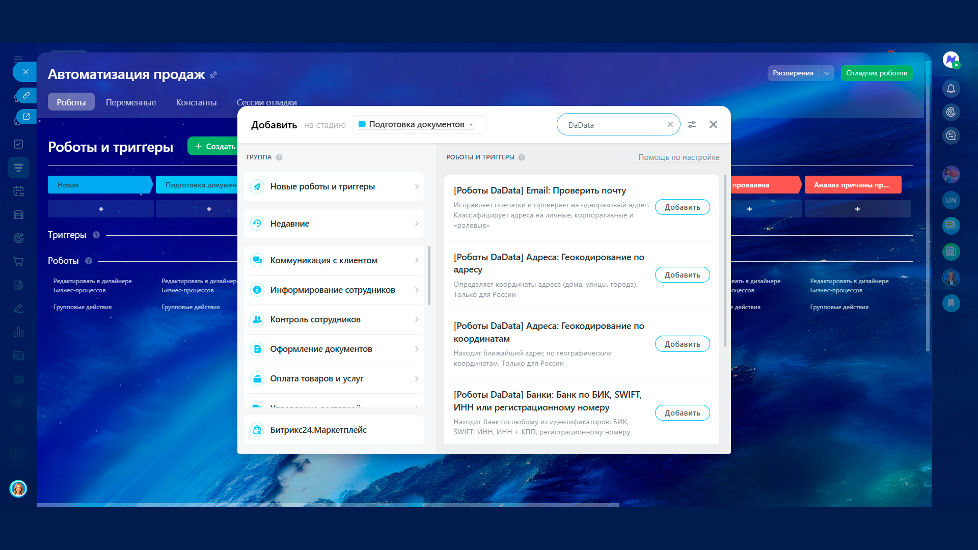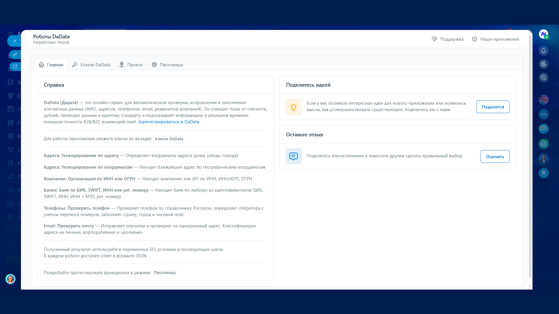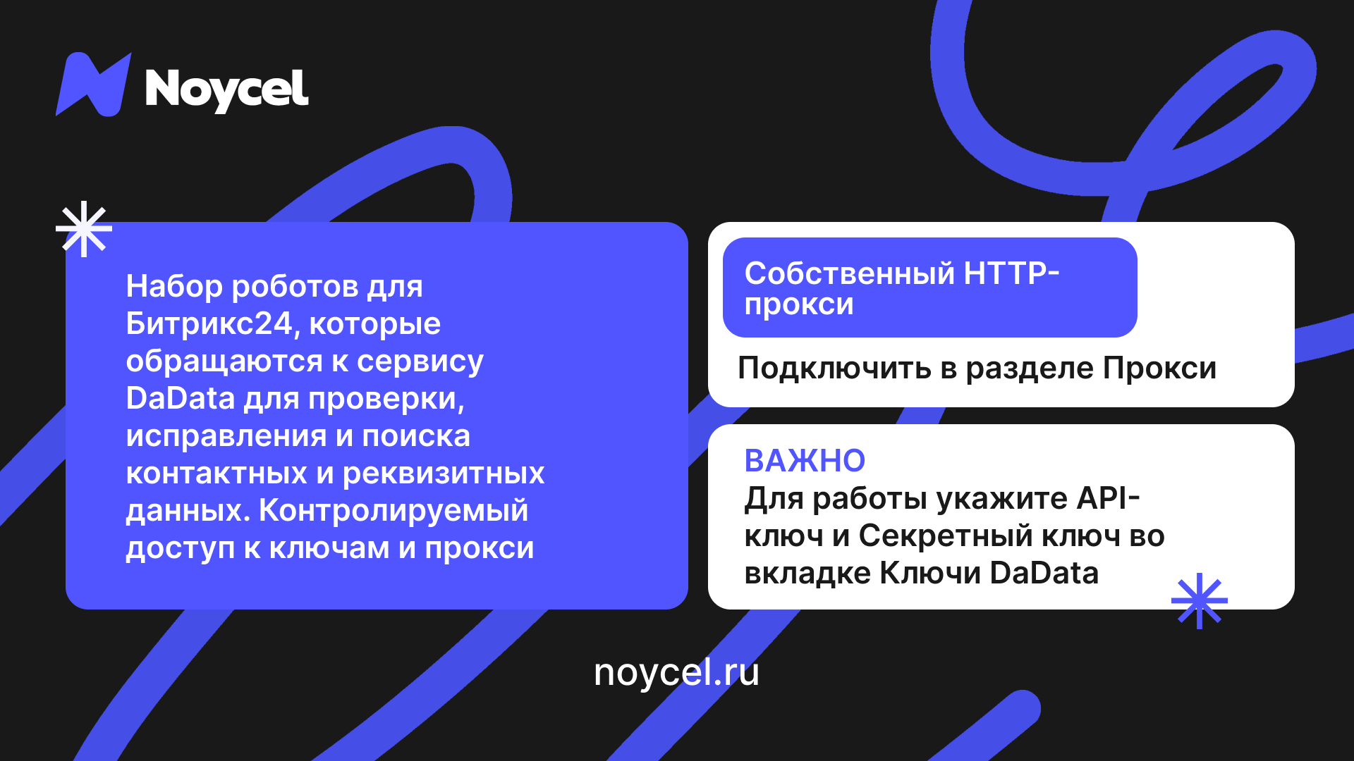 Роботы DaData — набор интегрируемых роботов для Битрикс24, которые обращаются к сервису DaData для проверки, исправления и поиска контактных и реквизитных данных. Поддерживаемые операции: автозаполнение и нормализация ФИО, адресов и координат, проверка телефонов и email, поиск организаций и банков по идентификаторам. Для работы укажите API-ключ и Секретный ключ во вкладке Ключи DaData; при необходимости можно подключить собственный HTTP-прокси в разделе Прокси. Доступ к настройкам ключей и прокси видят только те пользователи, которым администратор дал права.