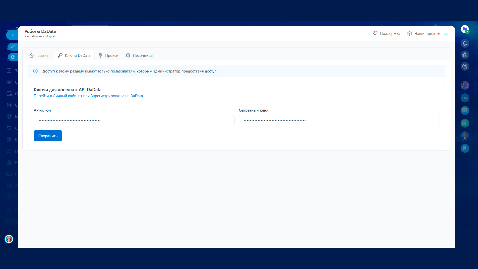 - Для работы требуется регистрация в DaData и ввод ключей в разделе Ключи DaData.