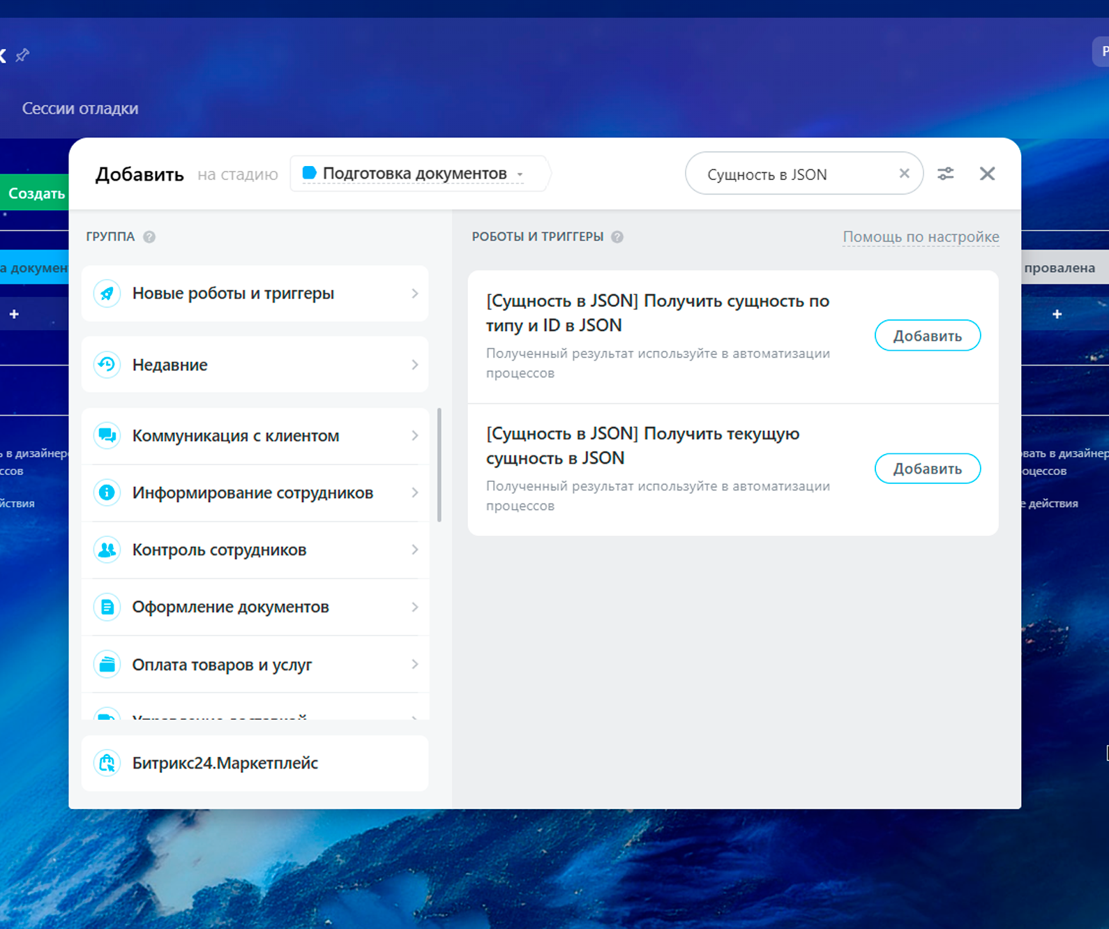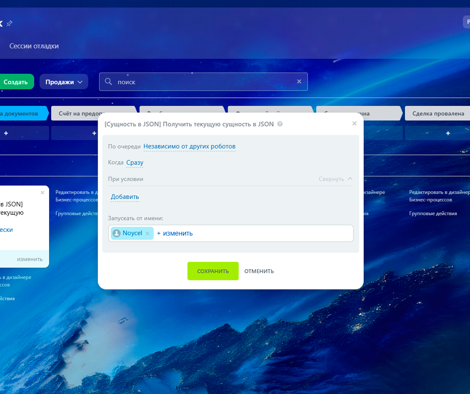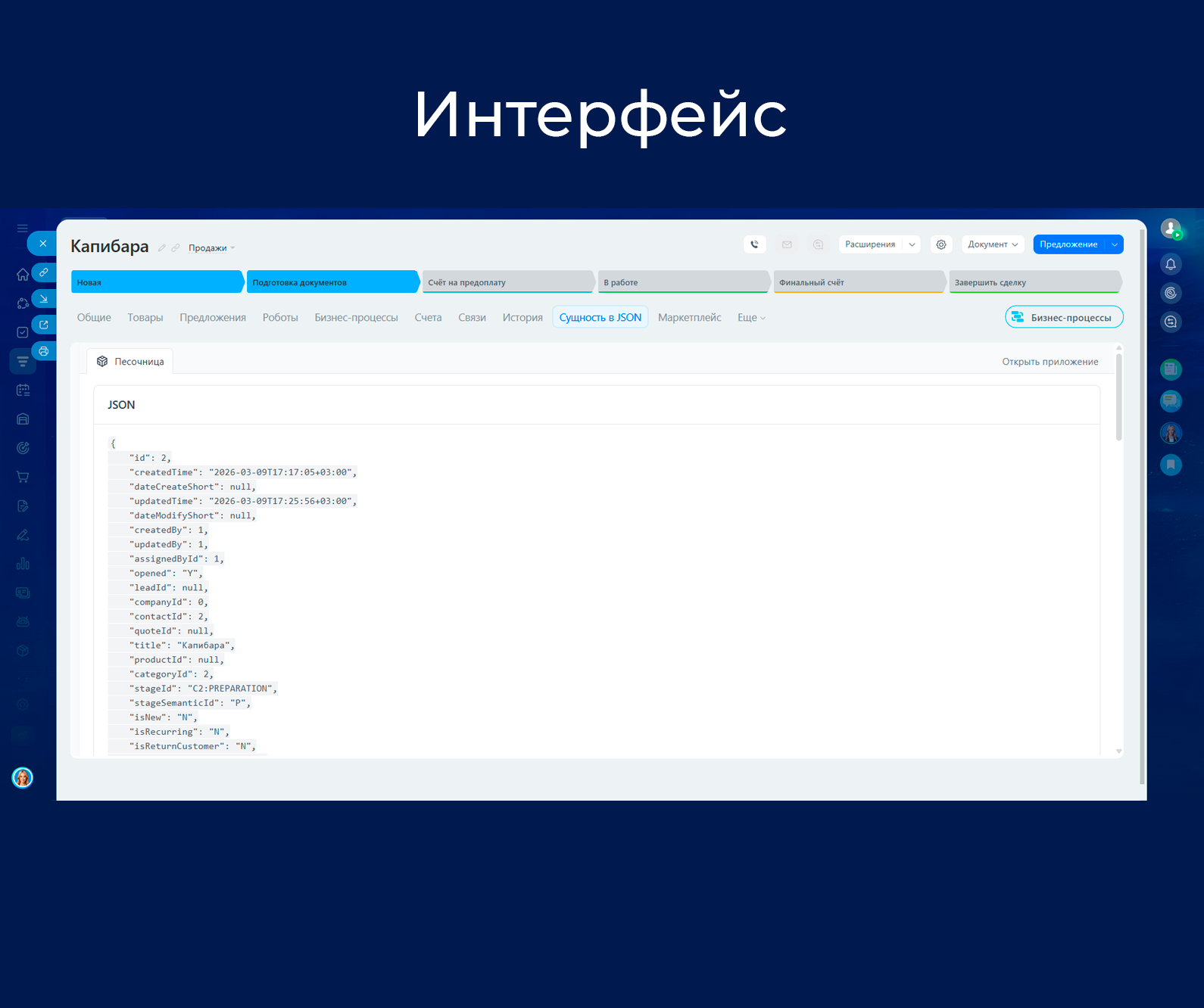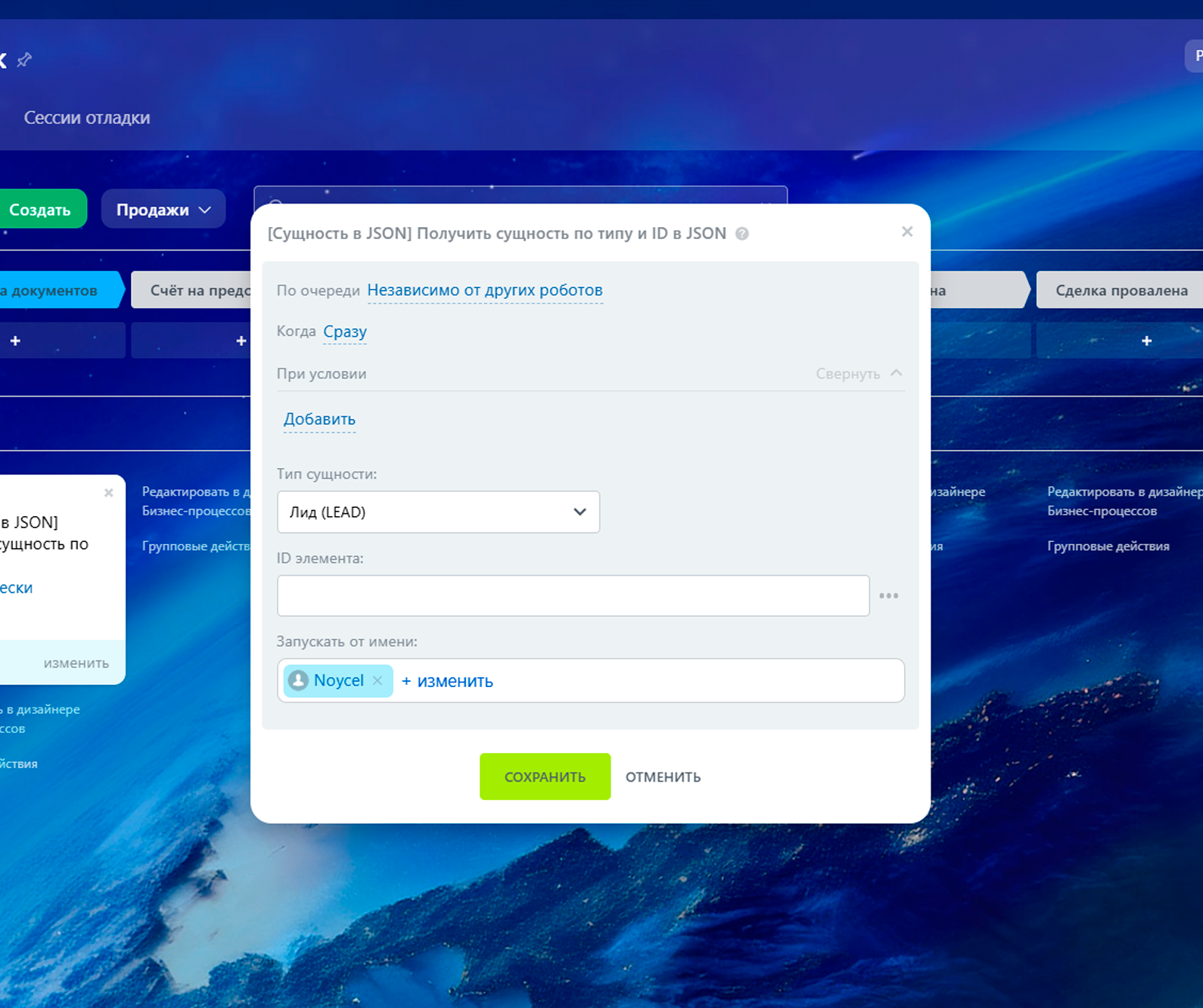 - Первый робот автоматически формирует JSON для сущности, в которой запущена автоматика (например, сделка).