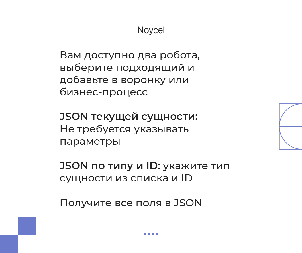 Робот для получения полной информации о сущности CRM (Сделка, Лид, Контакт, Компания и др.) в виде JSON. Позволяет брать данные текущей сущности в потоке автоматизации или запросить любую нужную сущность по типу и ID — без ручного выбора полей и сопоставлений.