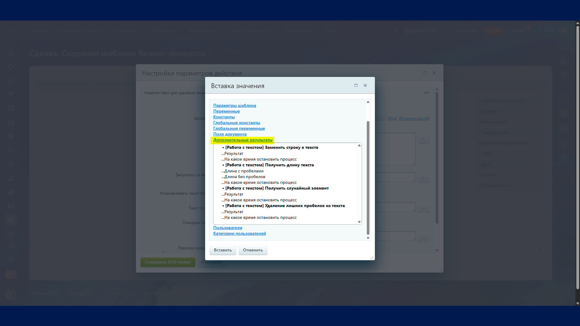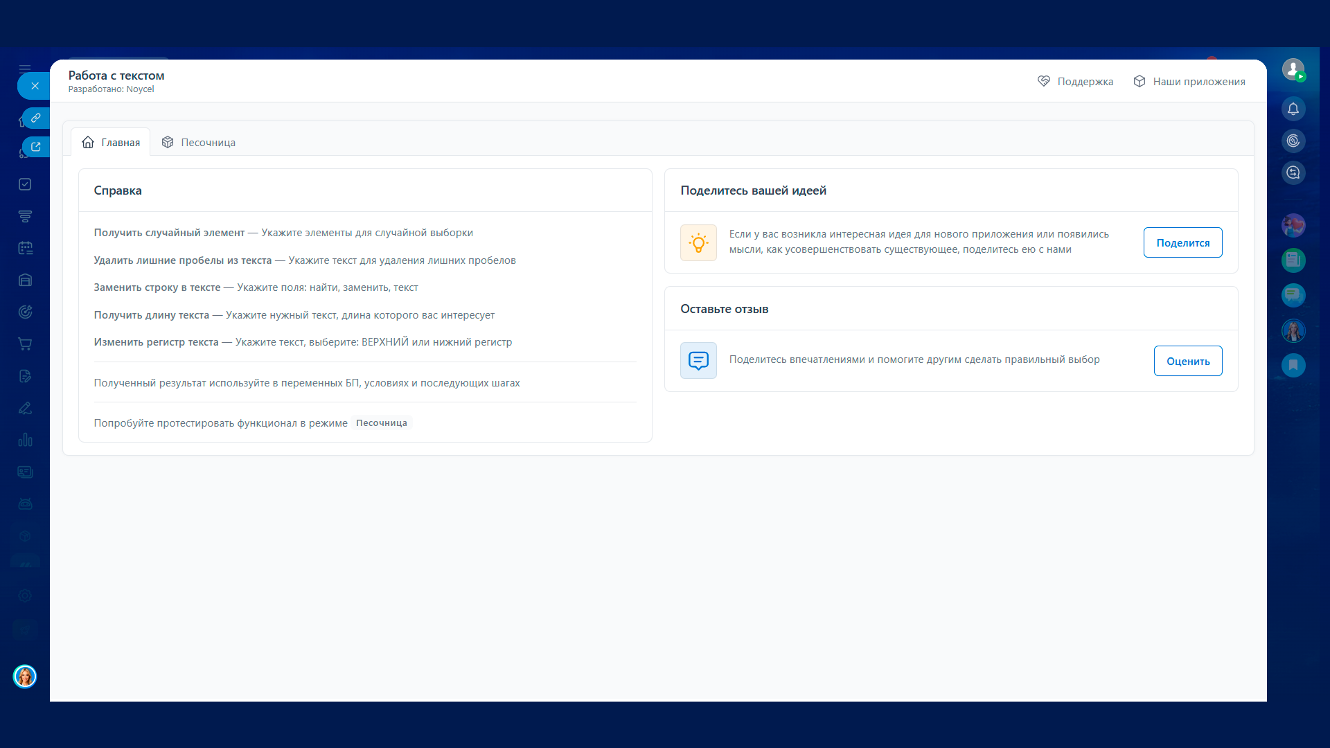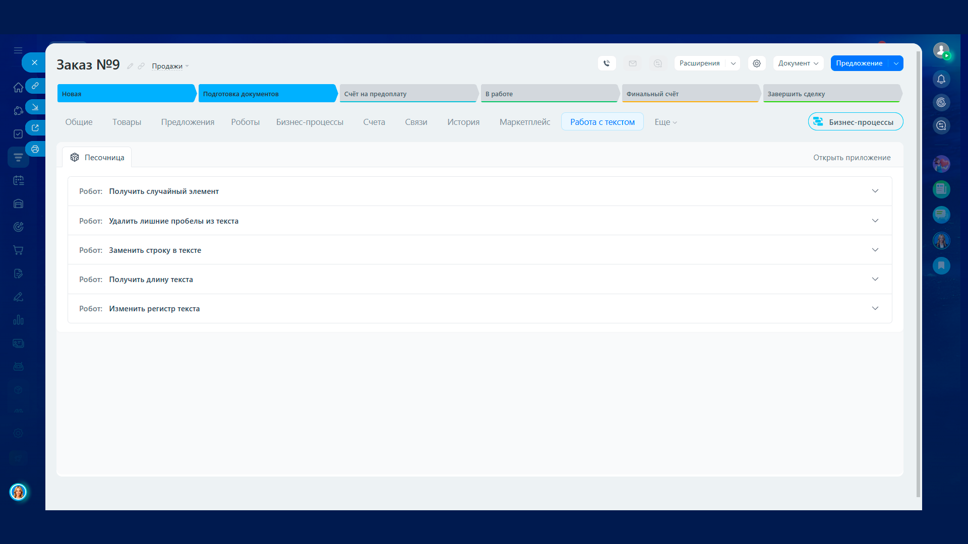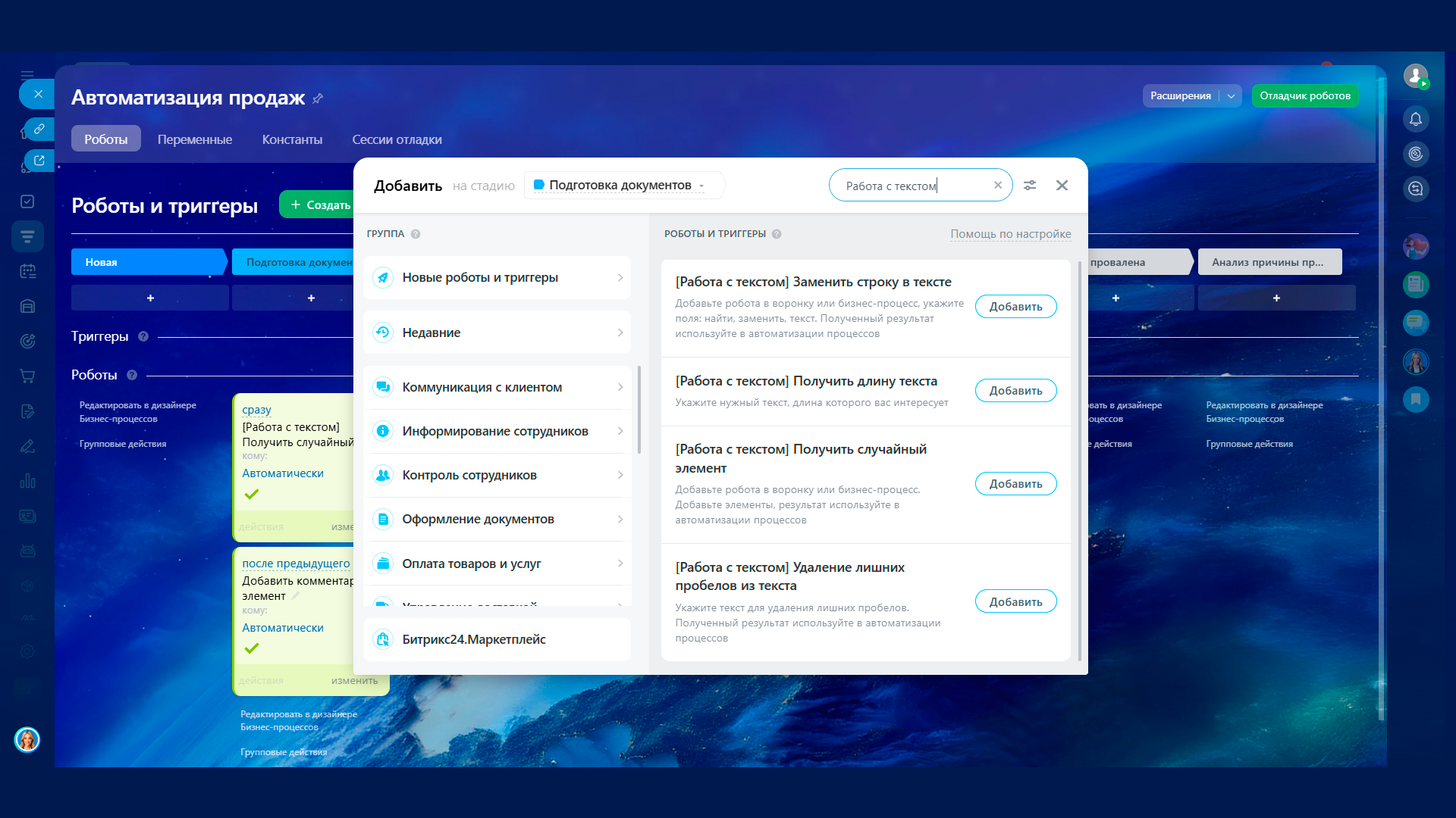 Работа с текстом — набор роботов для точечной обработки строк в бизнес‑процессах Битрикс24. Каждый робот возвращает результат, который можно записать в переменную БП, использовать в условиях и передать на следующих шагах.