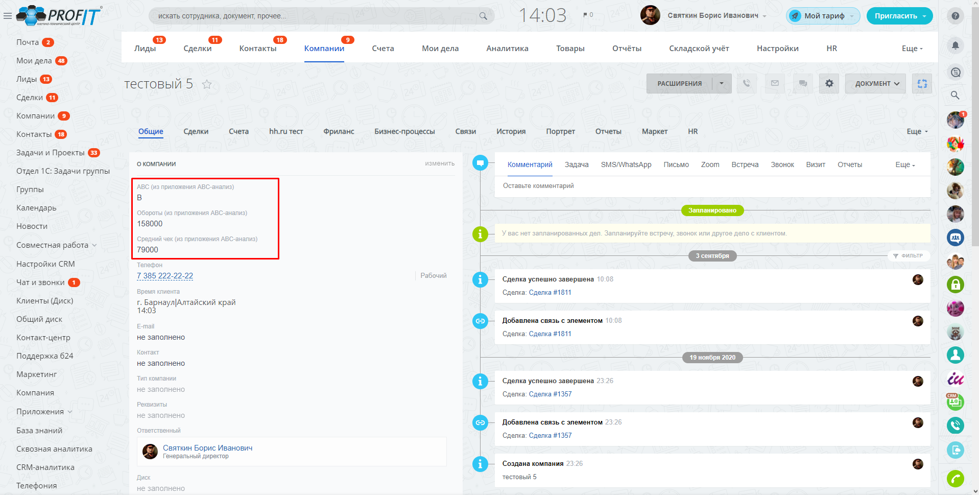 Приложение ABC анализ позволит строить отчеты классификации клиентов в Битрикс24, а также прописывает статус клиента в карточку компании.