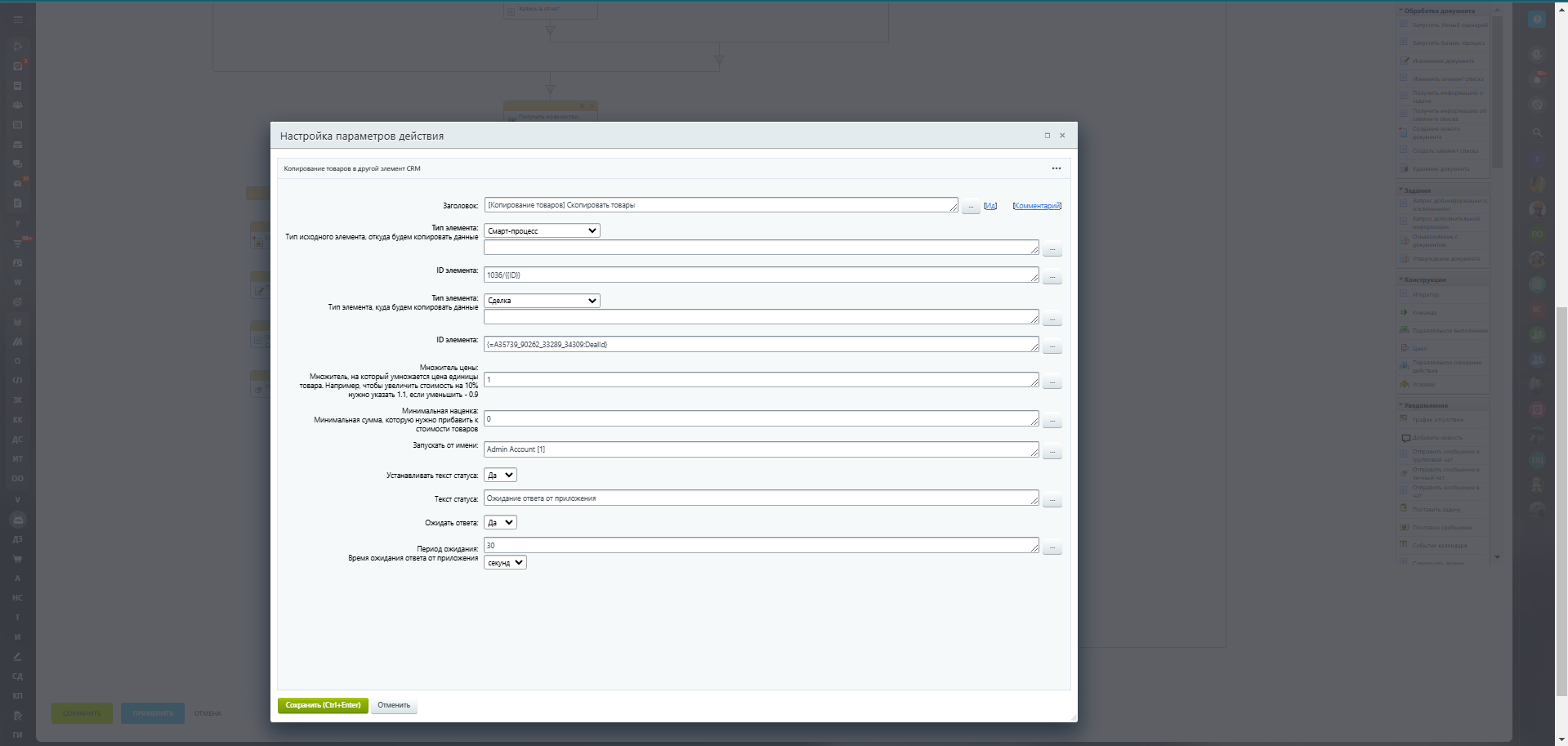 Тип исходного элемента – Элемент CRM и СП, откуда будут копироваться товары. Если копирование осуществляется из Смарт-Процесса, то в поле ID элемента нужно указать ID Смарт-Процесса слэш “/” и ID элемента