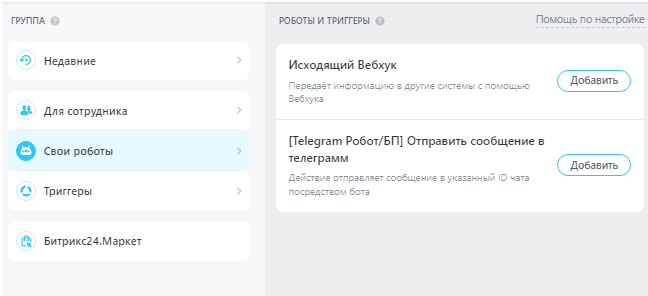 - Выберите "Свои роботы" и выберите из списка [Telegram Робот/БП] Отправить сообщение в телеграмм или введите название в поиске