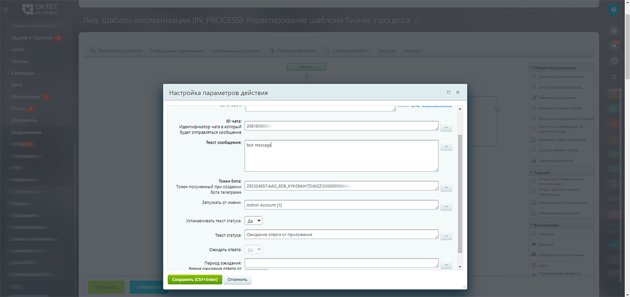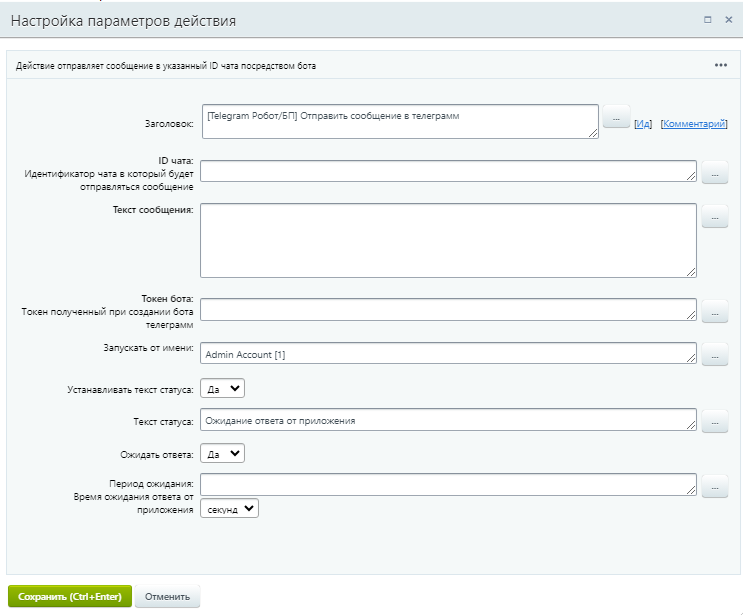 - Выберите "Действия приложений"->"[Telegram Робот/БП] Отправить сообщение в телеграмм"