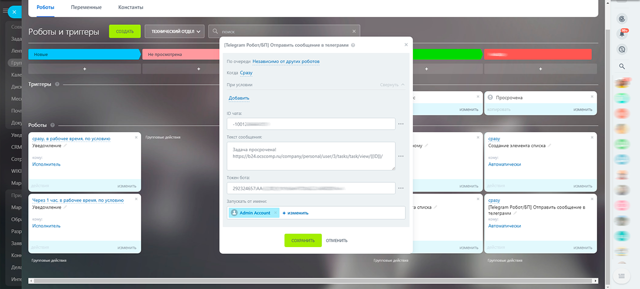 Отправляйте уведомления в корпоративные чаты или индивидуально сотрудникам. Новые лиды, просроченные задачи, любые изменения в процессах.