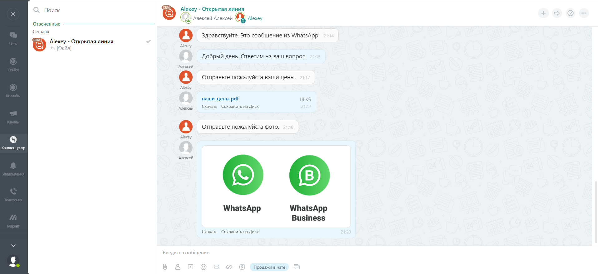 поддерживает отправку и получение мультимедийных сообщений (таких как изображения, видео, документы и аудио), что улучшает общение с клиентами и делает взаимодействие более разнообразным и эффективным.