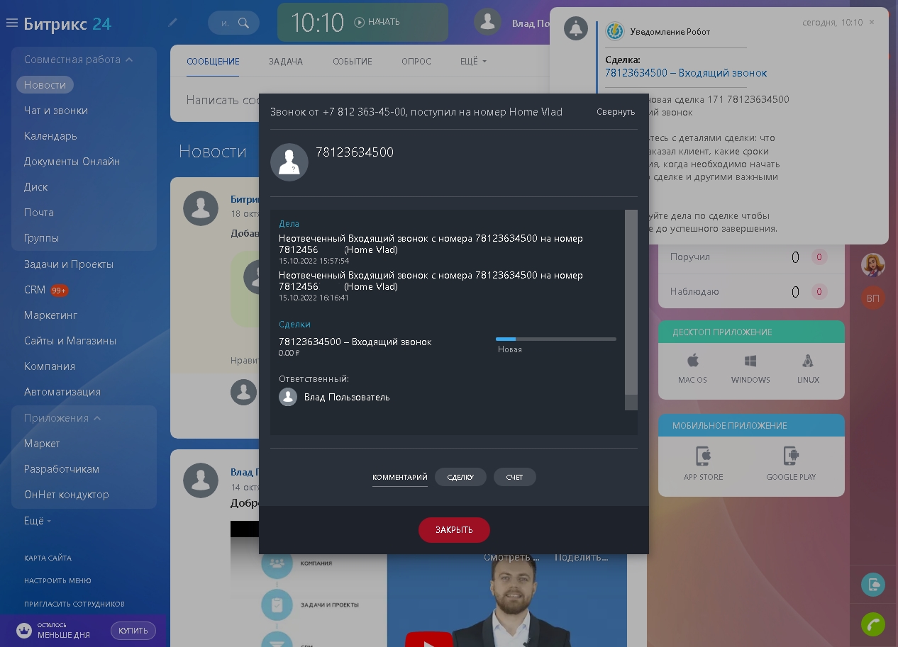 Автоматическое создание пользователя, лида, сделки, обращения при звонке с неизвестного номера или на новый номер при наборе вручную (включается/выключается в настройках).