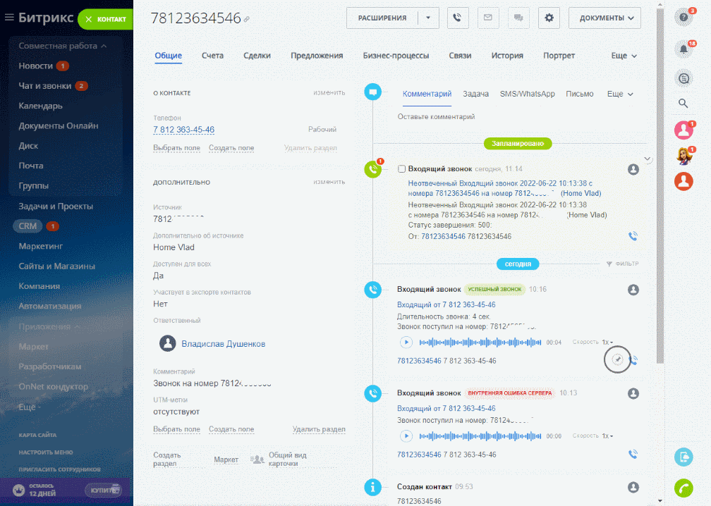 Совершение вызовов щелчком на номере из карточки Клиента/Лида/Сделки.