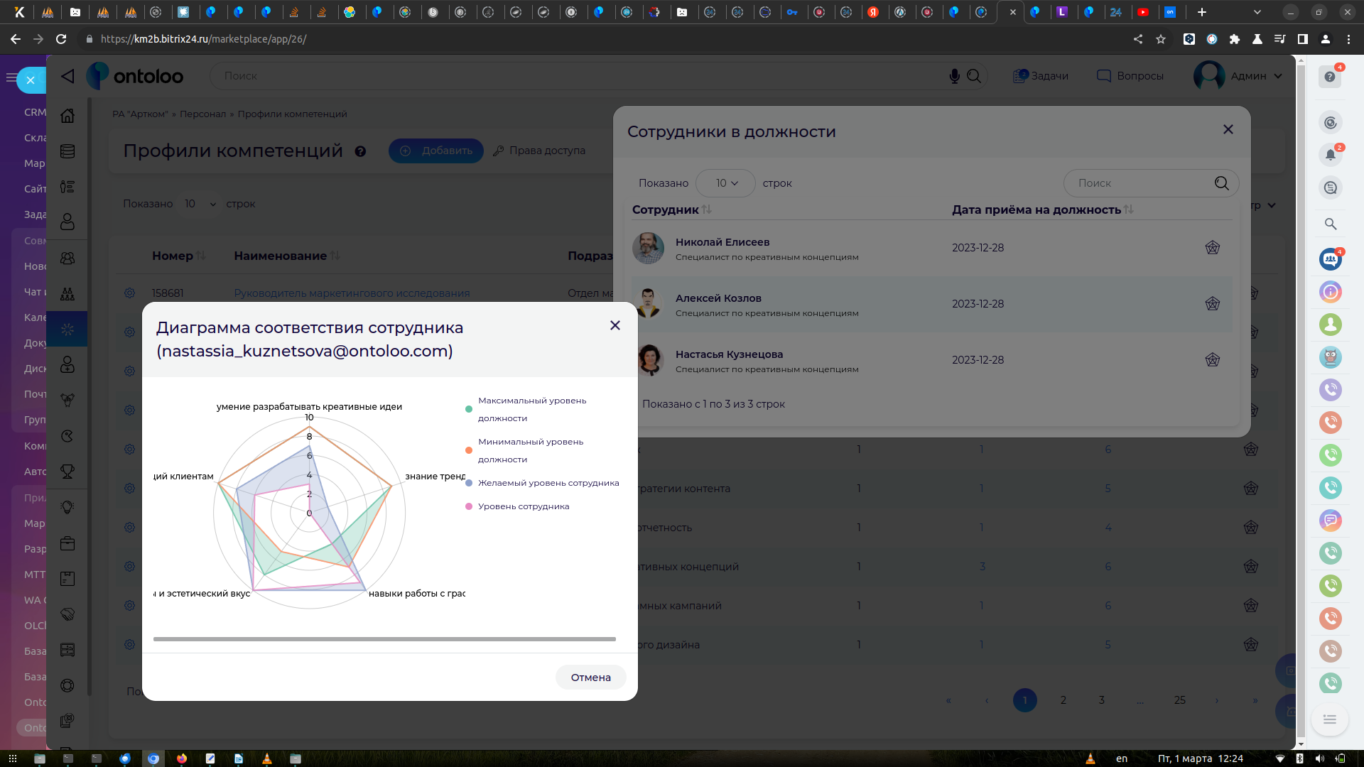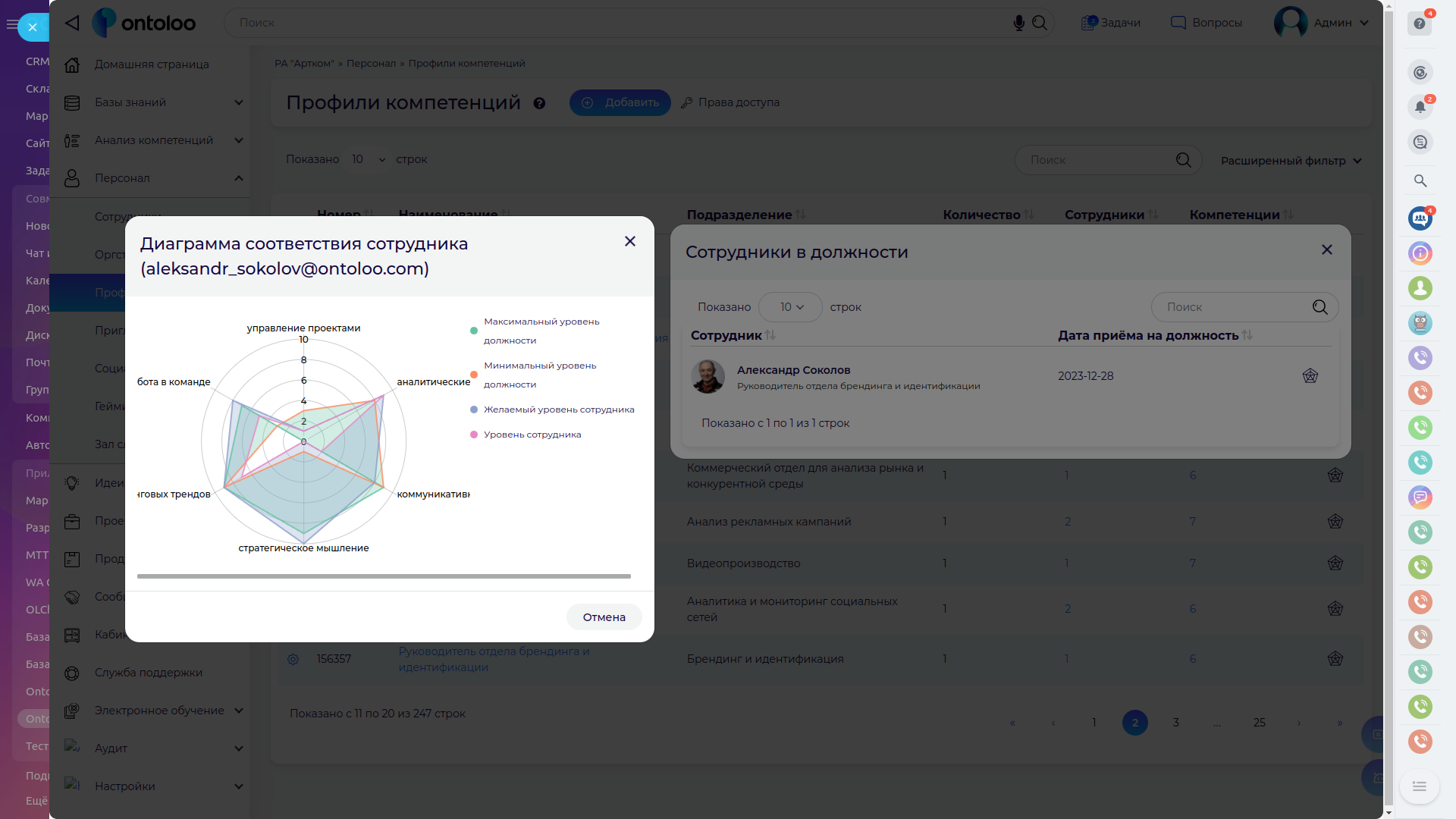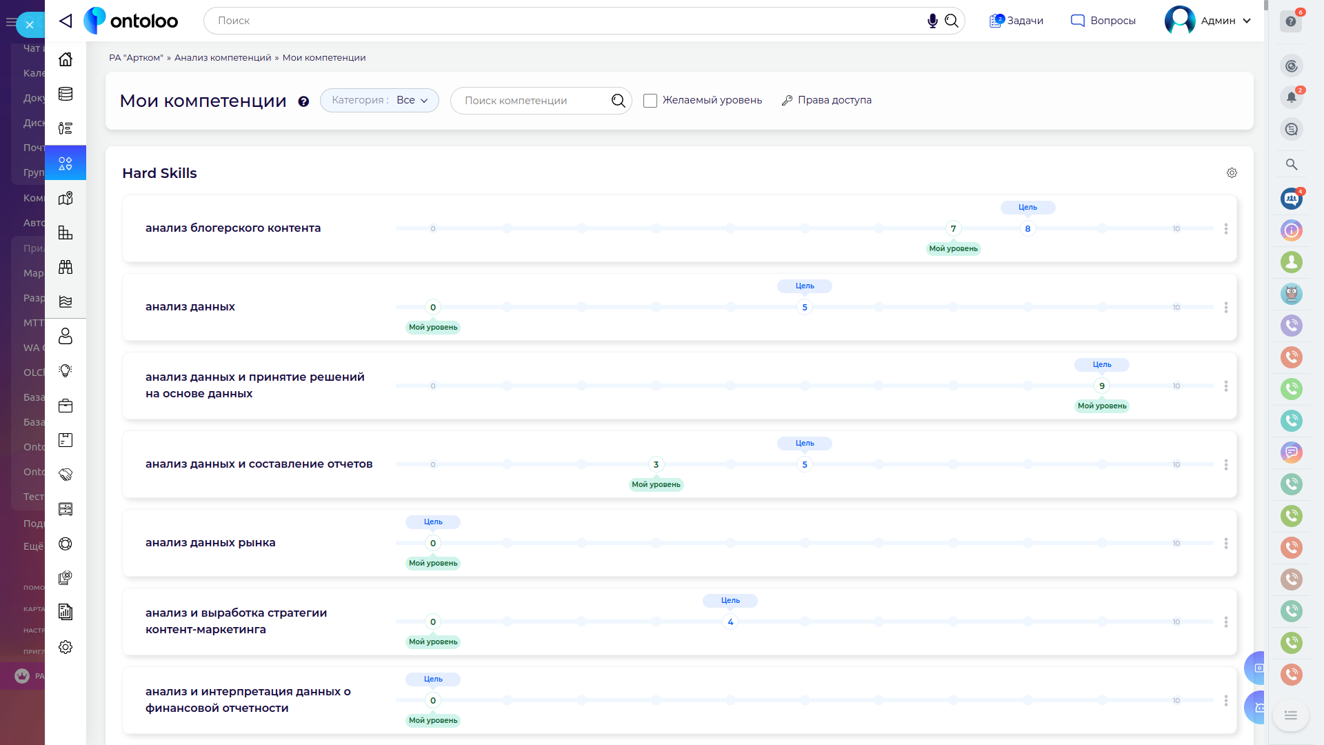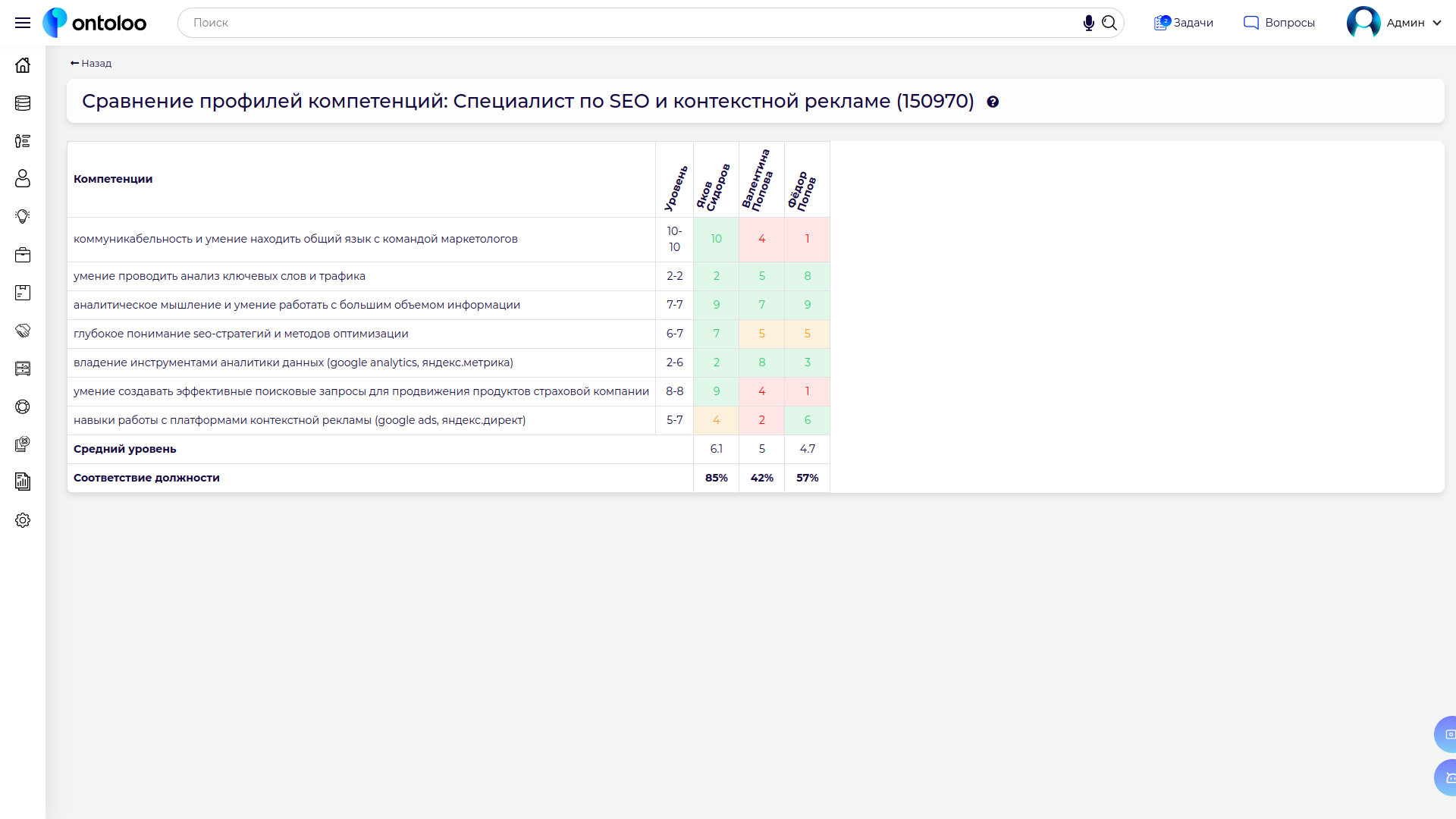 - Визуализация и оценка уровней компетенций сотрудников и организации в целом;