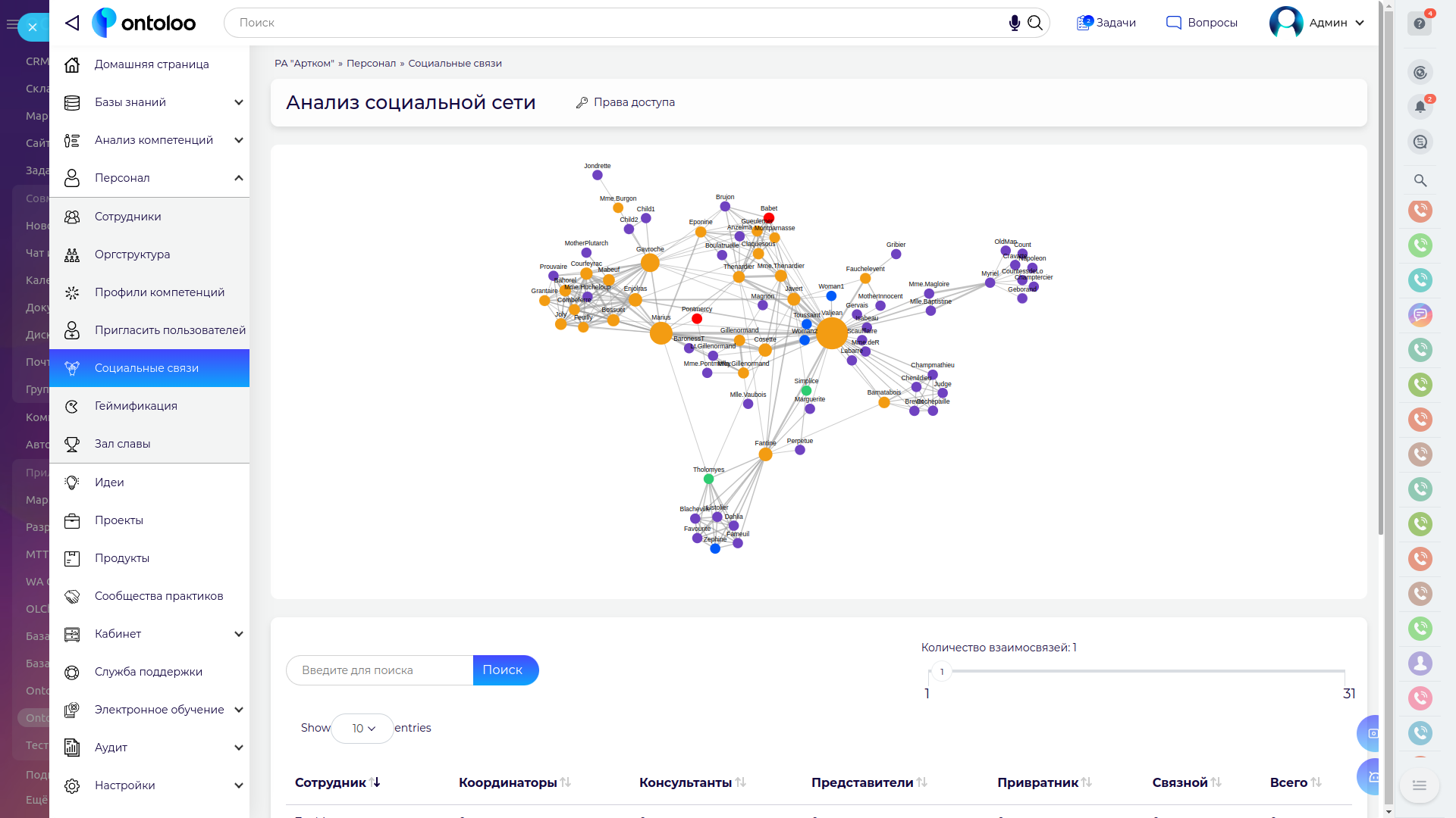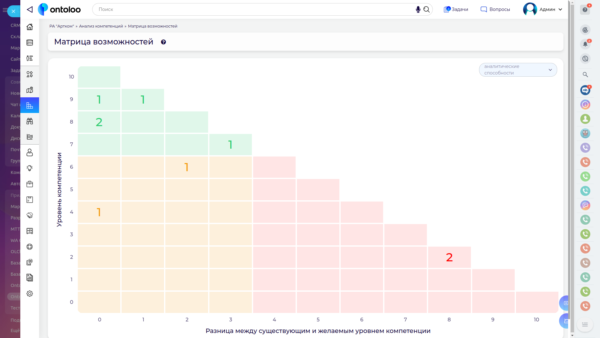 - Анализ компетенций: ONTOLOO поможет Вам получить полное представление о знаниях и опыте Ваших сотрудников. Вы сможете выявить ключевых специалистов, играющих роль связующих звеньев, а также определить компетенции, которые необходимо усилить или которые находятся под угрозой утраты.