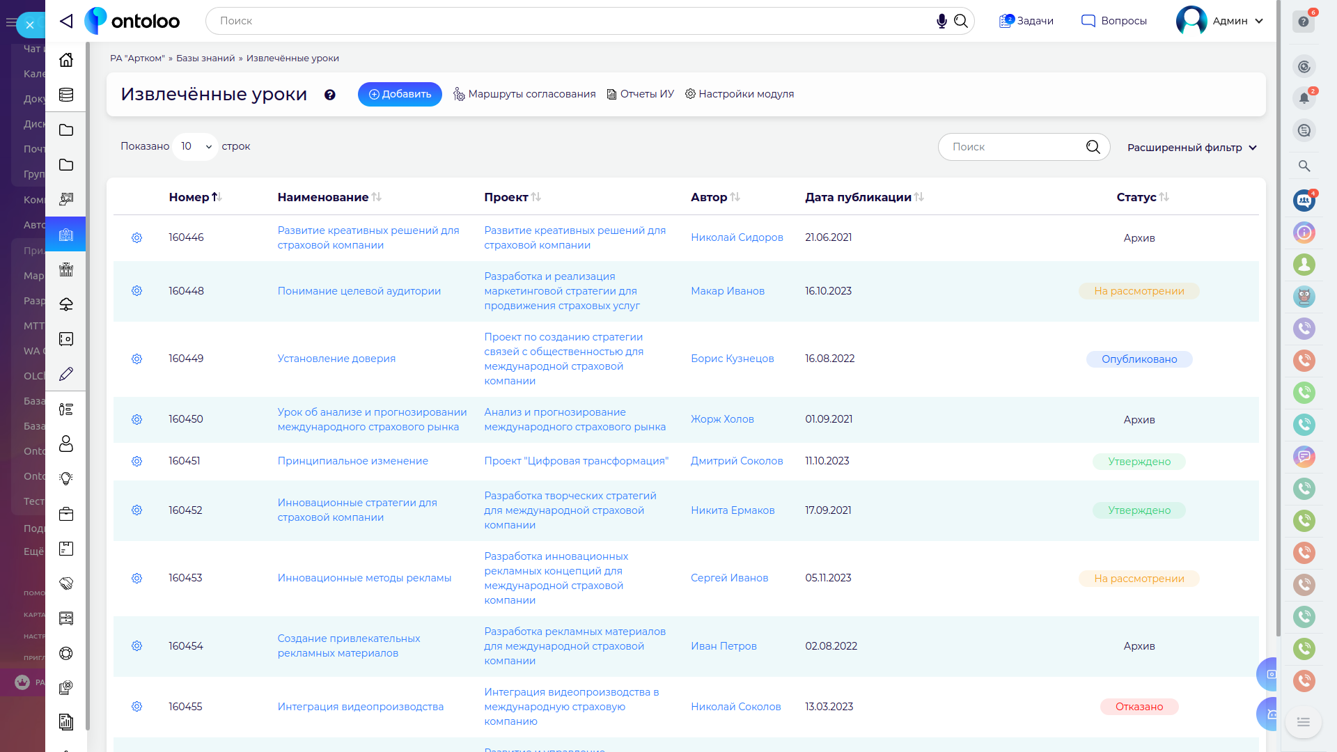 - Обновление и контроль знаний: Наша система обеспечивает систематический анализ формализованных знаний и обновление информации. Вы сможете использовать новые знания в бизнес-процессах, а также контролировать и управлять всеми вышеупомянутыми процессами, чтобы гарантировать их эффективное функционирование.
