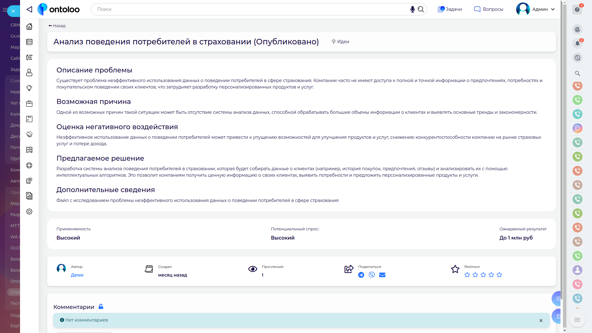 - Улучшение оперативности и качества управления: ONTOLOO позволяет быстро и эффективно находить, систематизировать и распространять знания внутри организации, что в свою очередь повышает оперативность принятия решений и качество управленческих процессов.