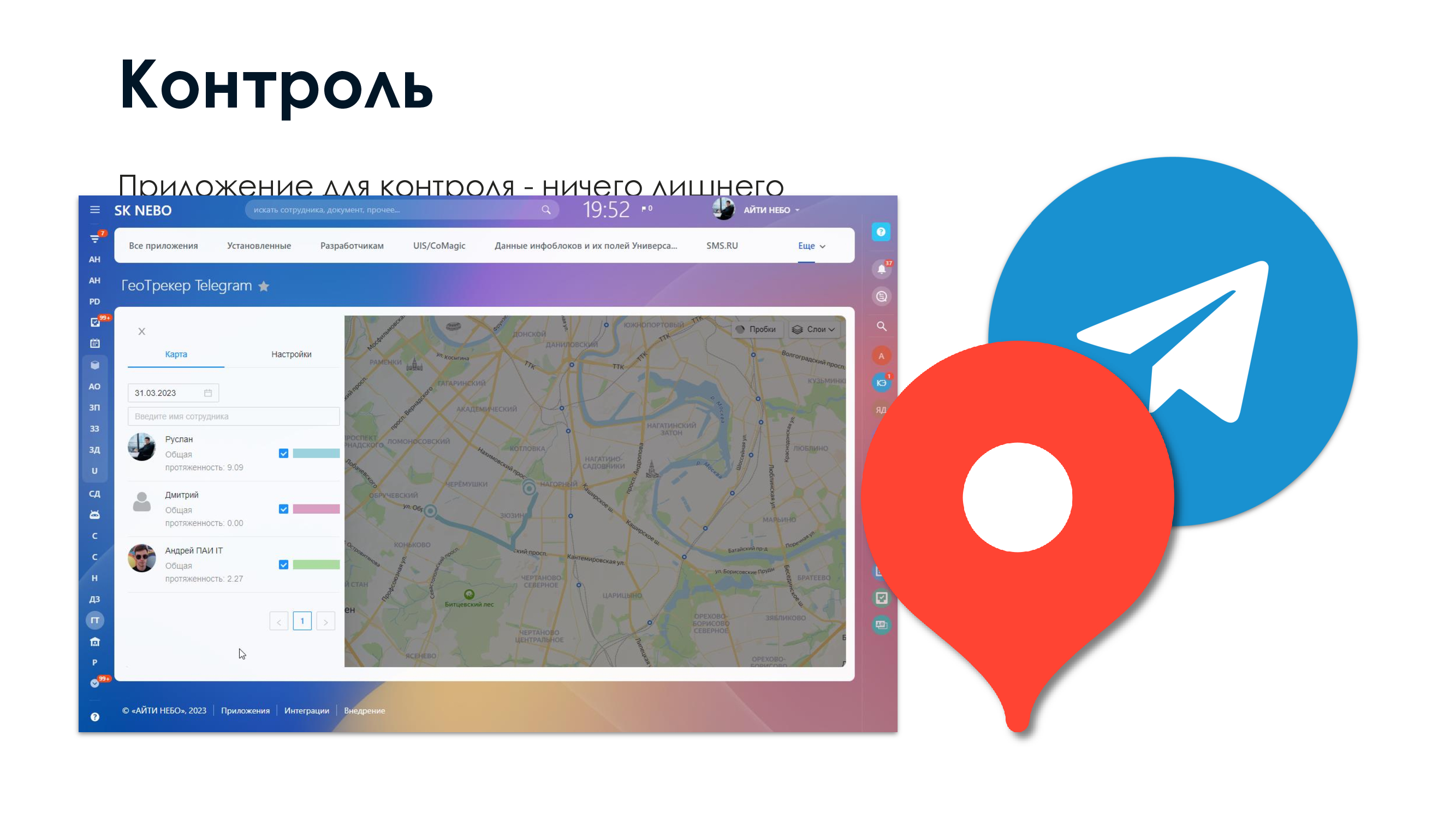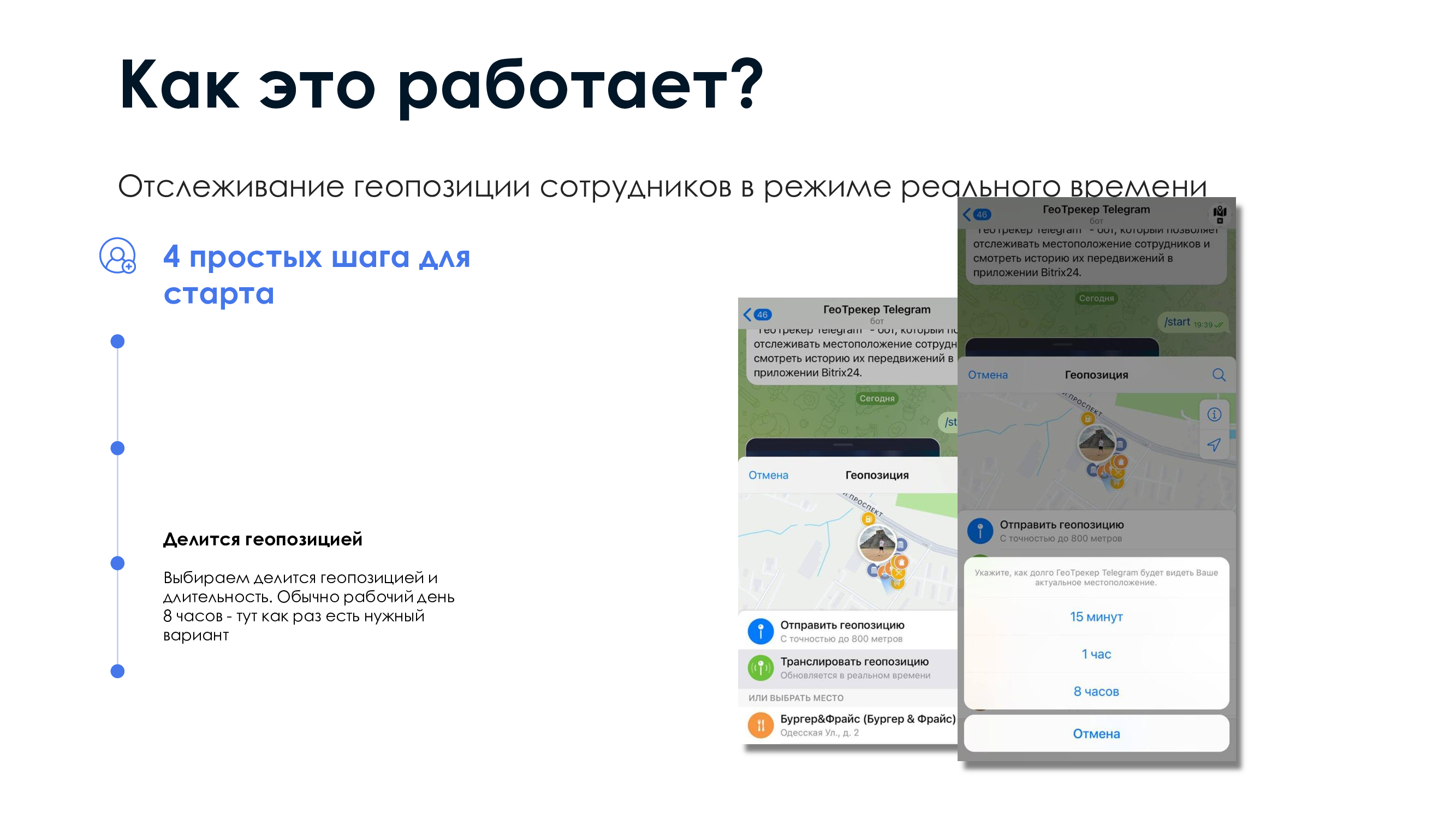 Отслеживание местоположения сотрудников: С помощью Телеграм-бота и функции трансляции геопозиции, приложение позволяет отслеживать местоположение сотрудников на карте.