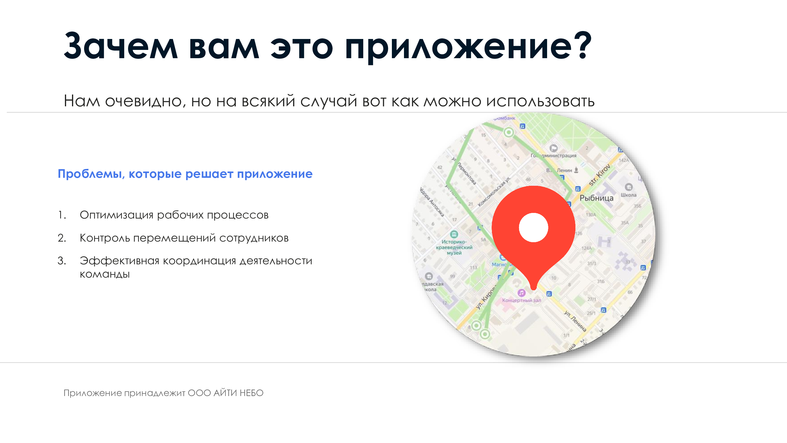 Это приложение, предназначенное для мониторинга геопозиции сотрудников. Оно позволяет контролировать перемещение пользователей в разный период времени, что может быть полезным для оптимизации рабочих процессов и координации деятельности на разных уровнях иерархии компании.