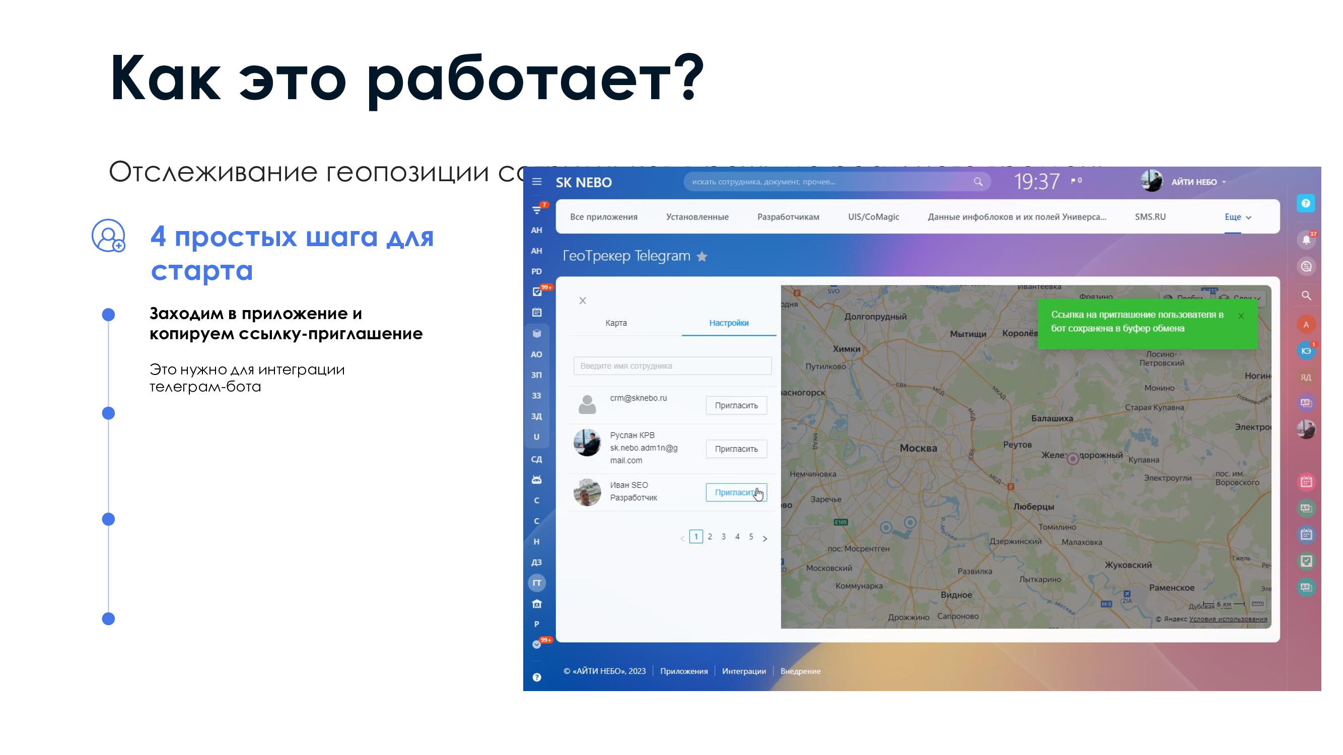 Нажав на кнопку "Пригласить" напротив нужного пользователя, вы копируете ссылку на Телеграм бота, с помощью которого пользователь сможет делиться своей геопозицией.