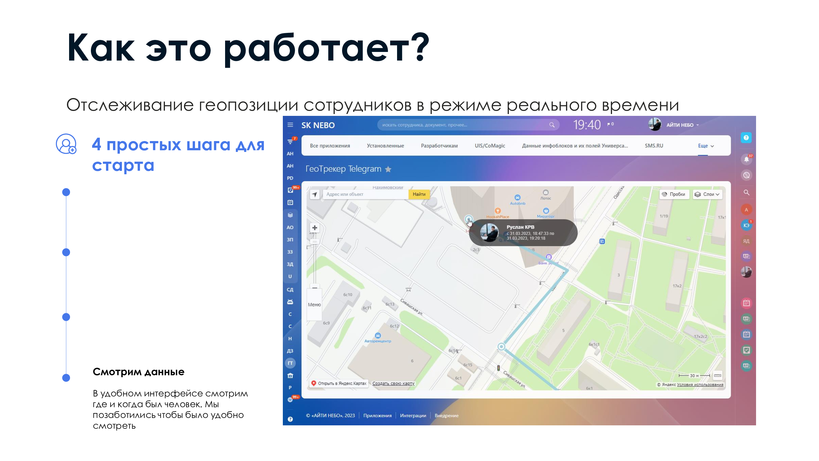 История перемещений: Приложение сохраняет историю перемещений каждого сотрудника, позволяя просмотреть ее позднее.
