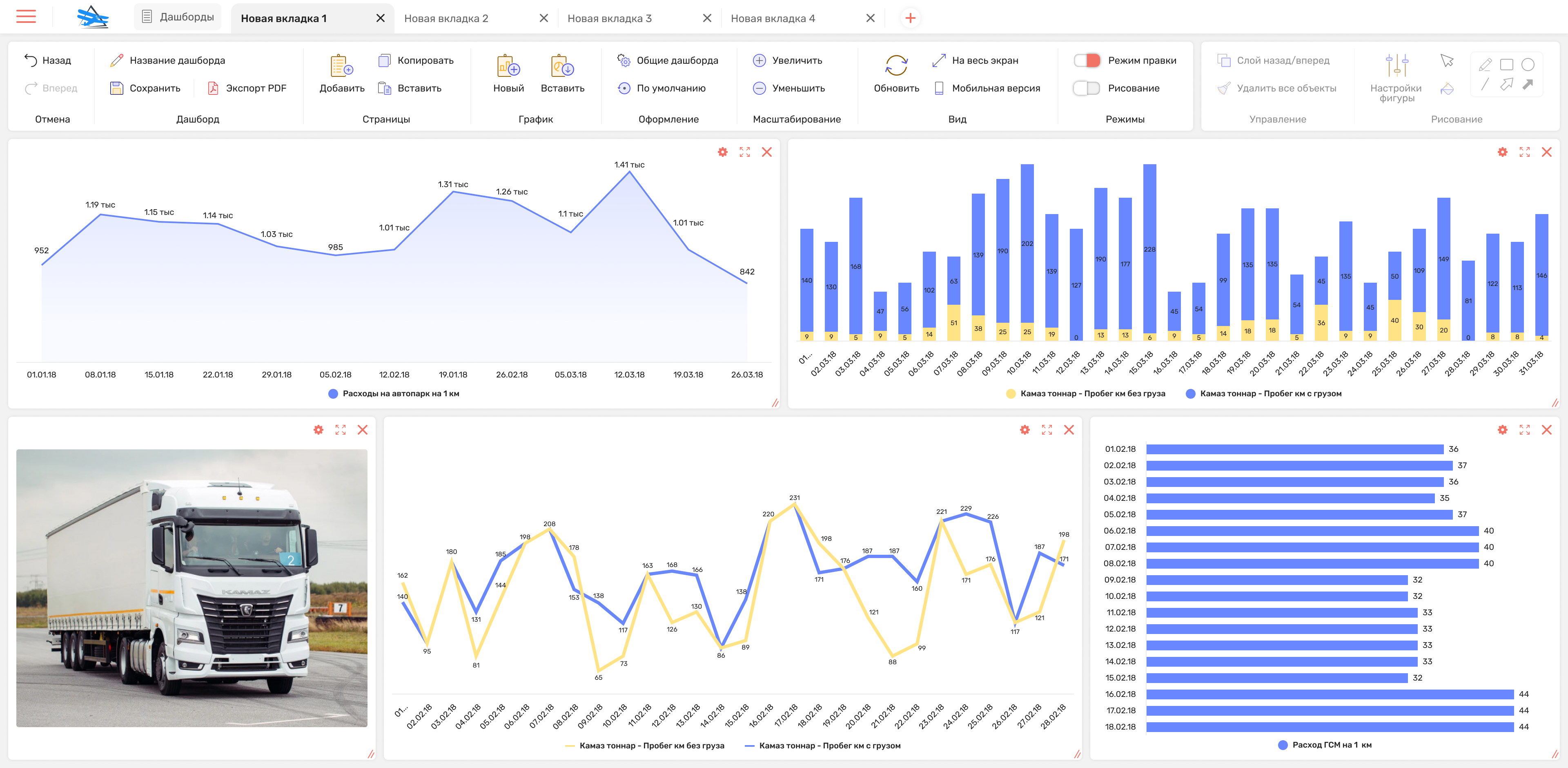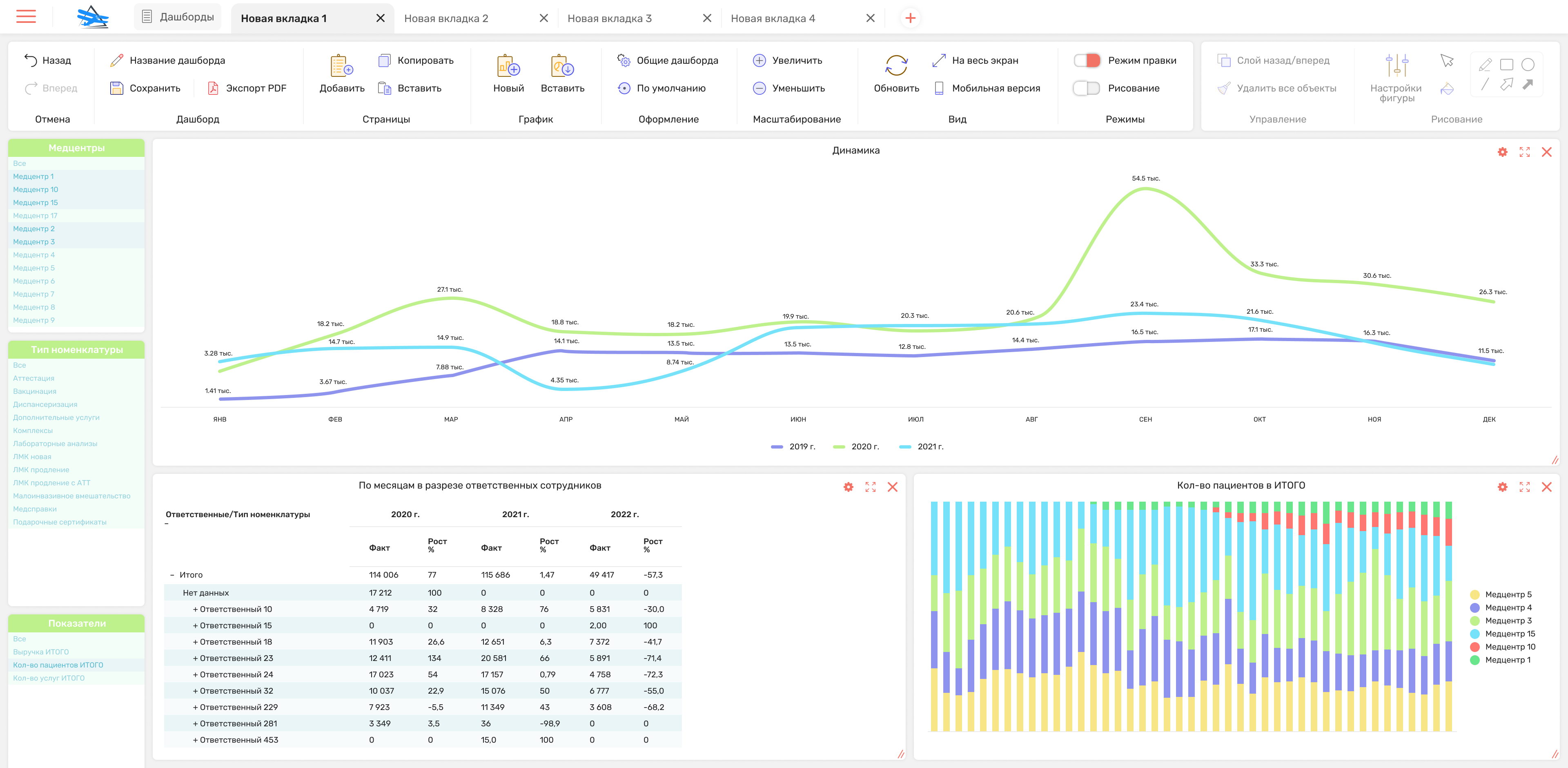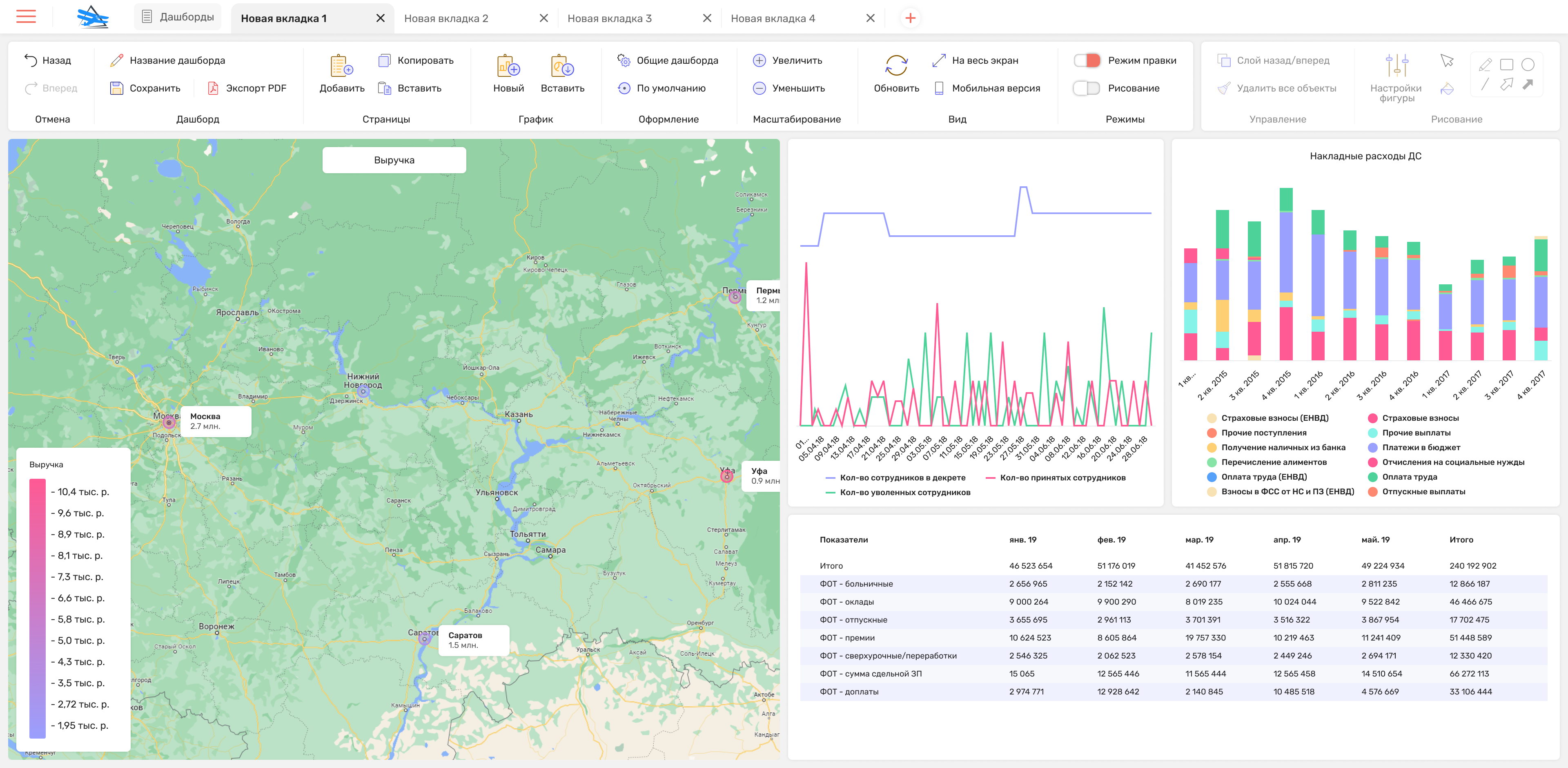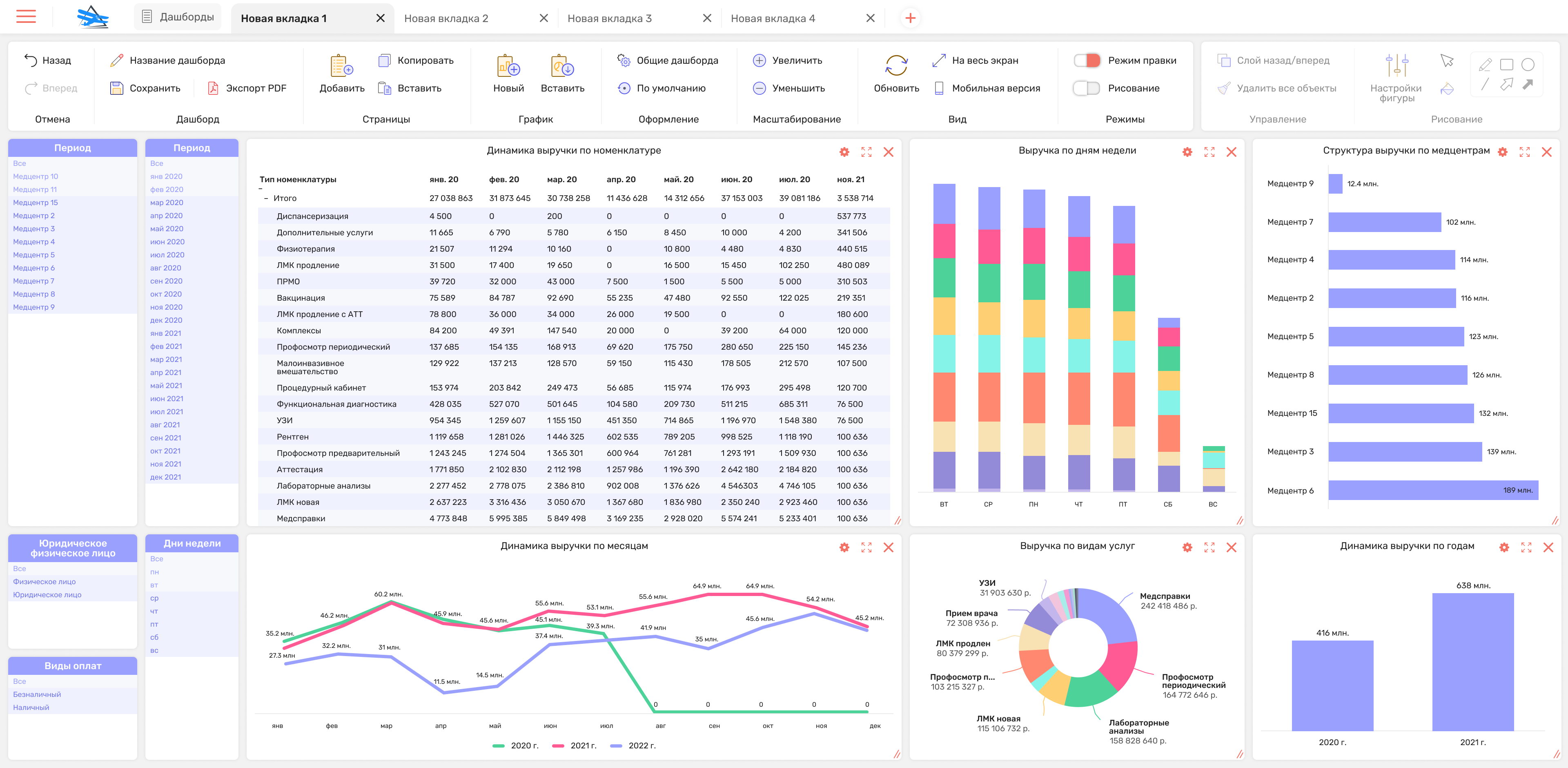 Встроенный конструктор дашбордов - в 10 раз быстрее создавайте отчеты и дашборды без использования кода (NO-CODE).